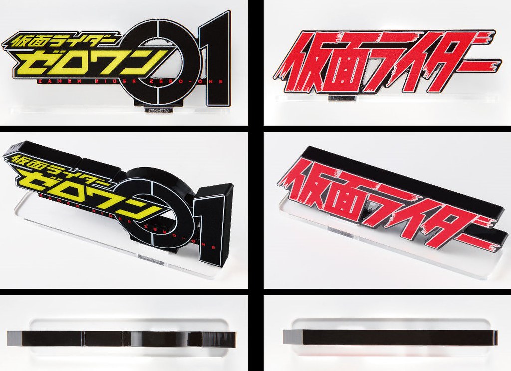將《假面騎士》與《假面騎士01》的「仮面ライダー」、「仮面ライダーゼロワン」字樣 LOGO 標誌立體化,以壓克力材質製作,精緻還原。厚度約為 11 毫米,充滿存在感與高級質感。作為一般桌面裝飾或與 S.H.Figuarts、模型搭配擺放都相當趣味。