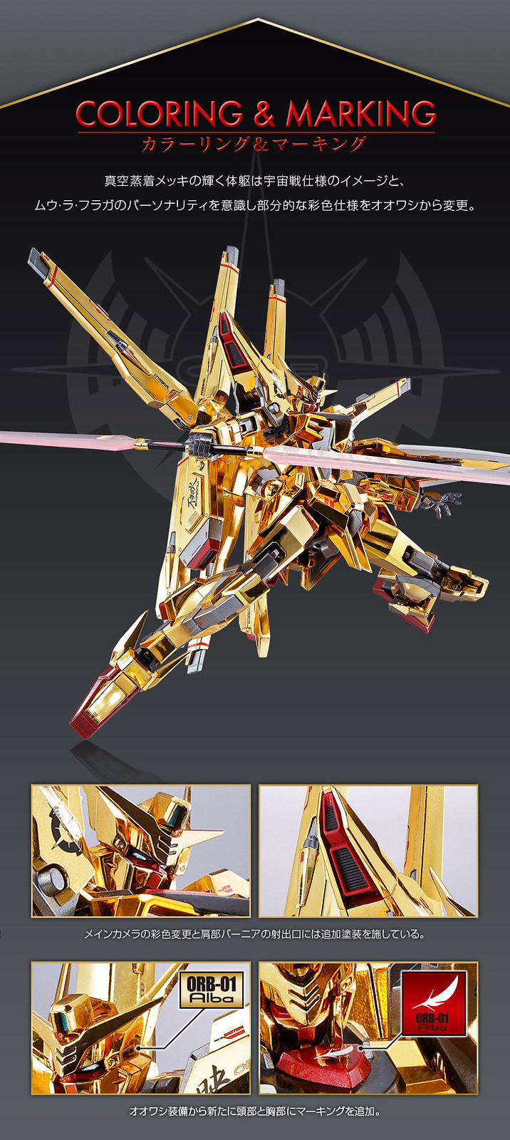 METAL ROBOT魂 曉鋼彈(不知火裝備)在本體部份沿用了大鷲裝備版本的造型,透過真空蒸鍍技術製作,膜層厚度相比一般電鍍更薄,使裝甲表面呈現金黃耀眼的色澤。容易磨損的關節處則使用膜層強度較高的電解電鍍製作,胸部、肩部的外露骨架以靜電塗裝,加強合金材質的厚重質感。多處骨架使用合金材質製成。不過有部份配色進行調整,雙眼頭部攝影機替換為亮藍色、肩部噴嘴改成紅框黑底,並在頭部側邊、胸口追加新的機身標誌。