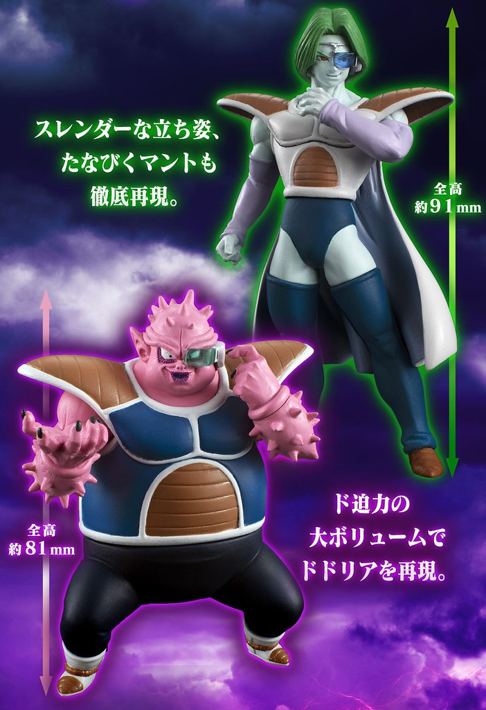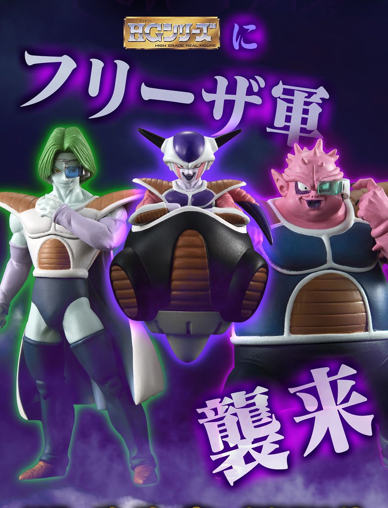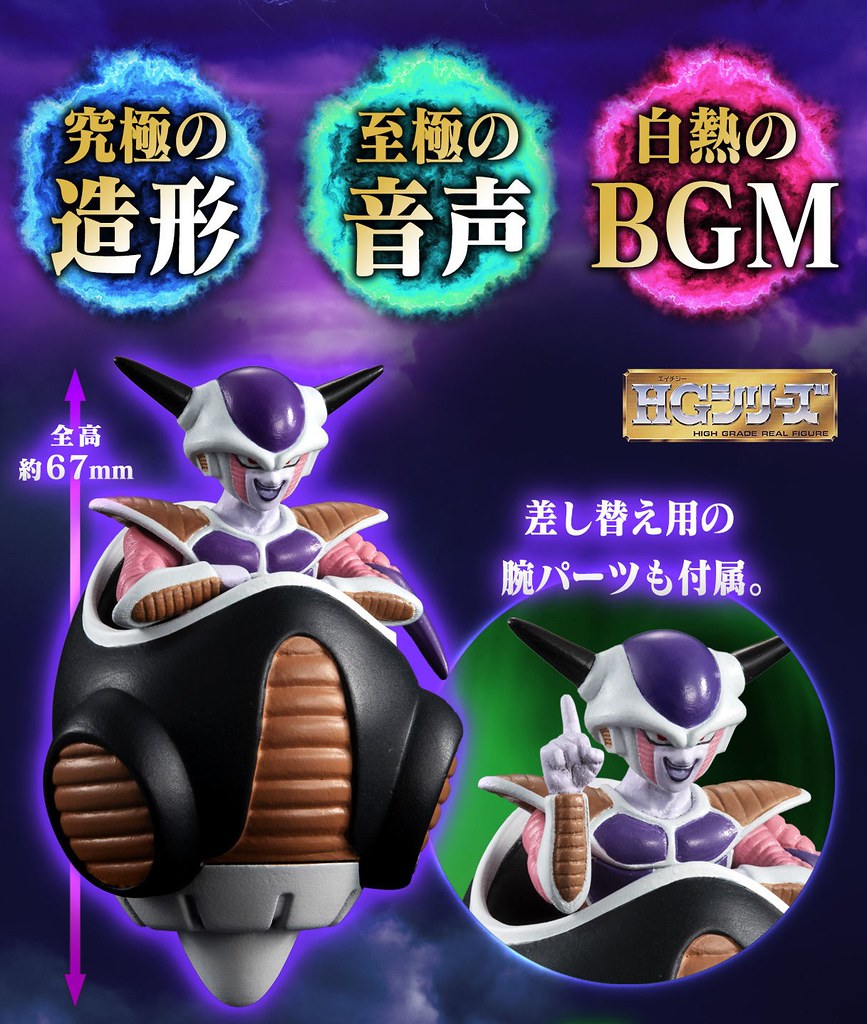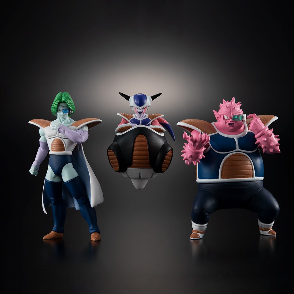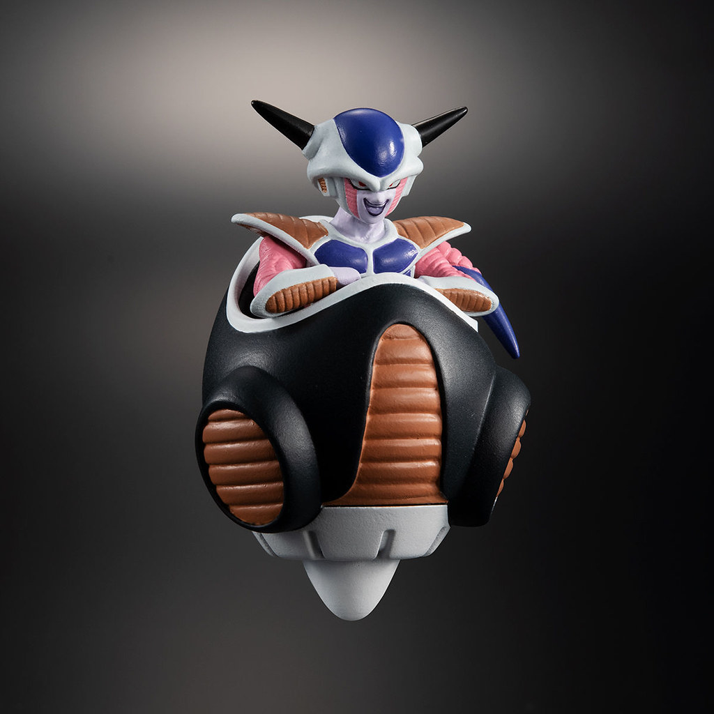 「HG 弗利沙軍團襲來篇」,陣容包含宇宙帝王-弗利沙(フリーザ)與他的心腹尚波(ザーボン)、多多利(ドドリア),以及內建音效功能的宇宙船底座,相當精彩豐富。全高約 67mm 的第一型態弗利沙,以乘坐在飛行器之姿呈現,附有可替換的手勢可以還原劇中場景。