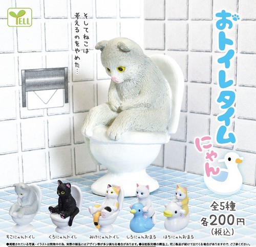 將貓咪擬人化蹲廁所的趣味模樣轉蛋化,推出五款分別在馬桶與兒童尿壺上的五種貓咪!無論是無奈、放空,還是很舒服的樣子都非常好笑又可愛!蹲馬桶的陣容為:灰貓、黑貓、三毛貓;小白貓和八字眉小貓則是坐在可愛的鴨子尿壺上。每款貓的姿勢設計都略有不同,算是頗有誠意的一組轉蛋!