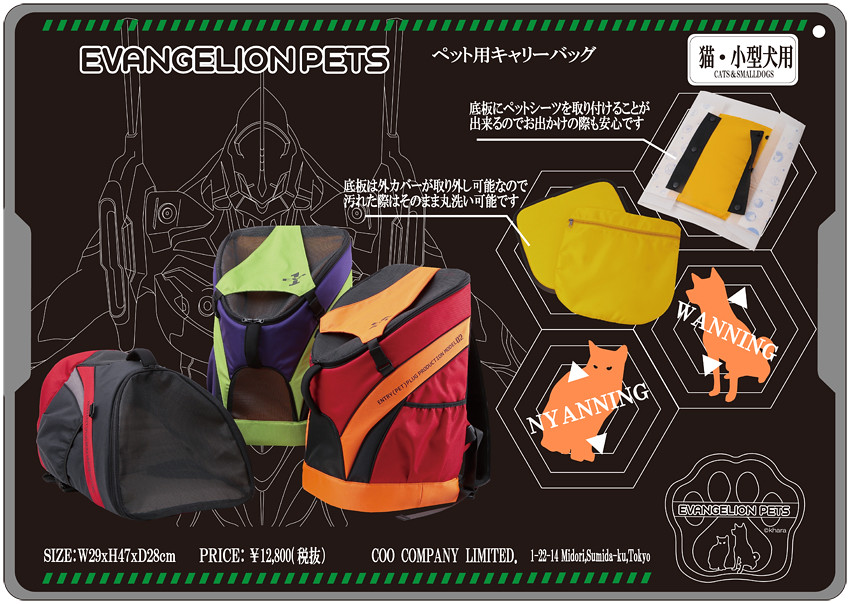 尺寸約為 寬29 x 高47 x 深28 公分,可以給8公斤以下小型貓犬使用的寵物包,分別推出初號機與貳號機、BLACK-NERV本部配色的三種款式,並提供後背與手提兩種攜帶模式,參考售價為 12,800日圓。