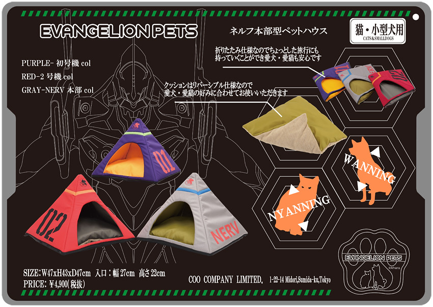 將可愛的寵物小屋換上EVA風格,三種款式分別為初號機、貳號機,NERV本部。除了趣味的圖樣,還有易於攜帶的可折疊的設計,讓貓狗外出時也能有個安心的小窩。附有毛絨和尼龍材質的兩面用內墊,可以在不同季節時更換使用,參考售價為 4,900日元。