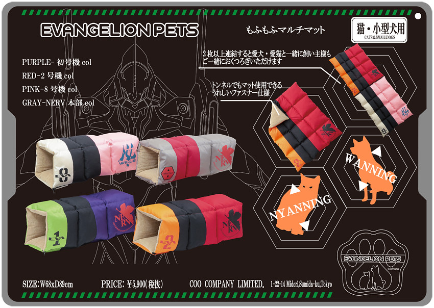蓬鬆可愛的寵物墊,可以平鋪也可以折起來作為貓咪通道使用,透過拉鍊設計還能將多個寵物墊組合使用。共有初號機、貳號機、8號機與NERV四種款式,每款尺寸為 68 × 89 公分,參考售價 5,900日元。