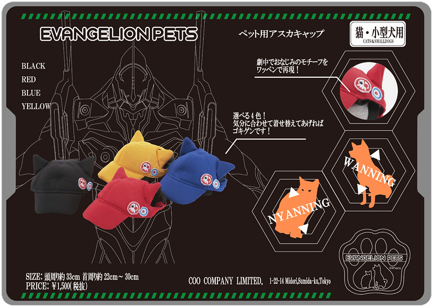 將劇中明日香所配戴的貓耳帽子設計為寵物用帽,並有還原設計的徽章!頭圍約33公分、頸圍22-30公分,分別推出黑、紅、藍、黃四種配色,參考售價為 1,500日元。