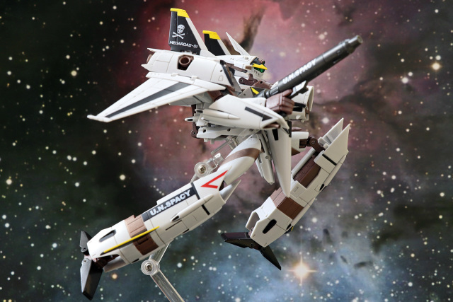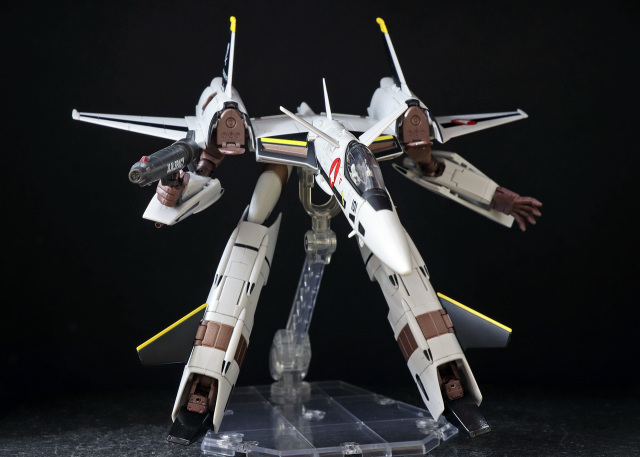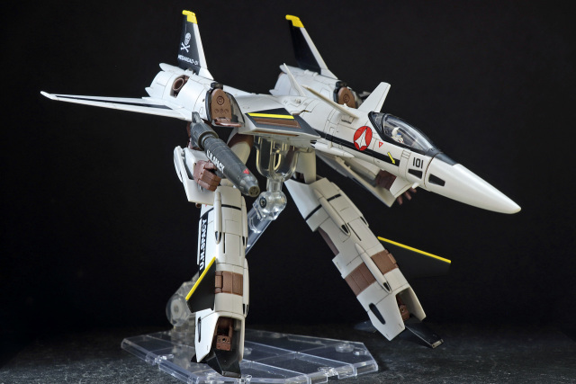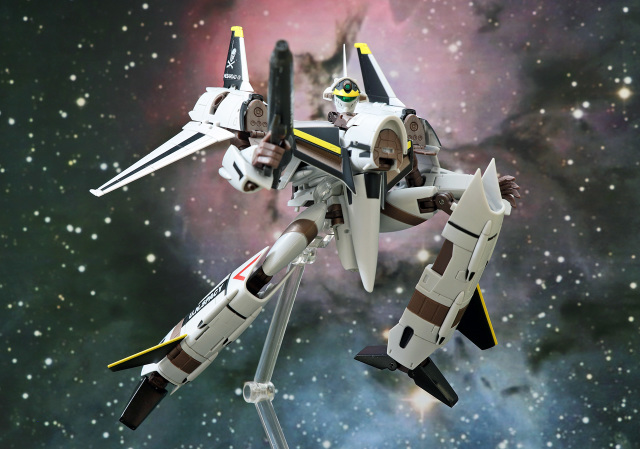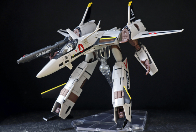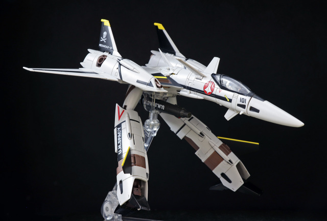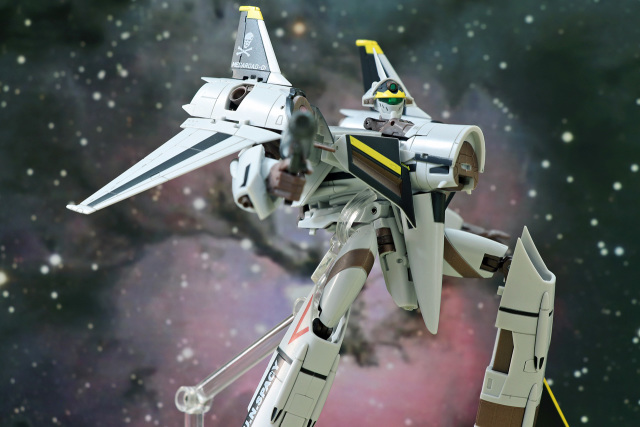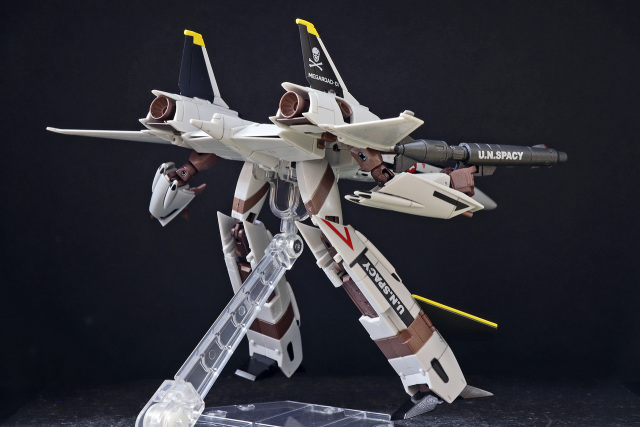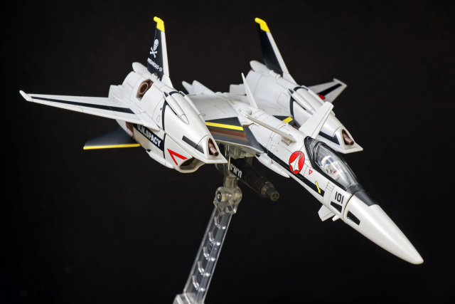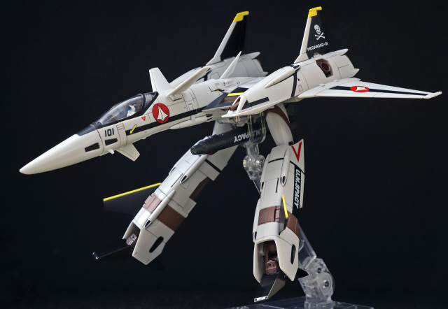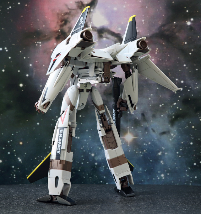 主體 (Battroid Mode) 尺寸高約 150mm,配件有交換用手形件左右各 3 種、著陸脚架、腳部配件、支袈及台座、專用佩鎗及鎗柄等等。當然也有完全三段式變型結構的設計,故可玩性是不俗的。本體以灰白色為基調搭上黑、黄色的線條以及印著「骷髏」的圖樣,作為菜迷的我這次倒是避無可避...... 另我用了灰色滲線,效果倒是不錯的!