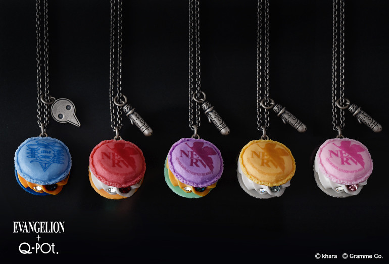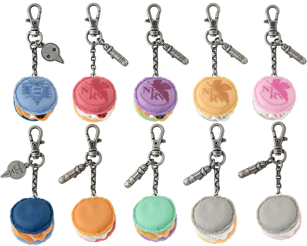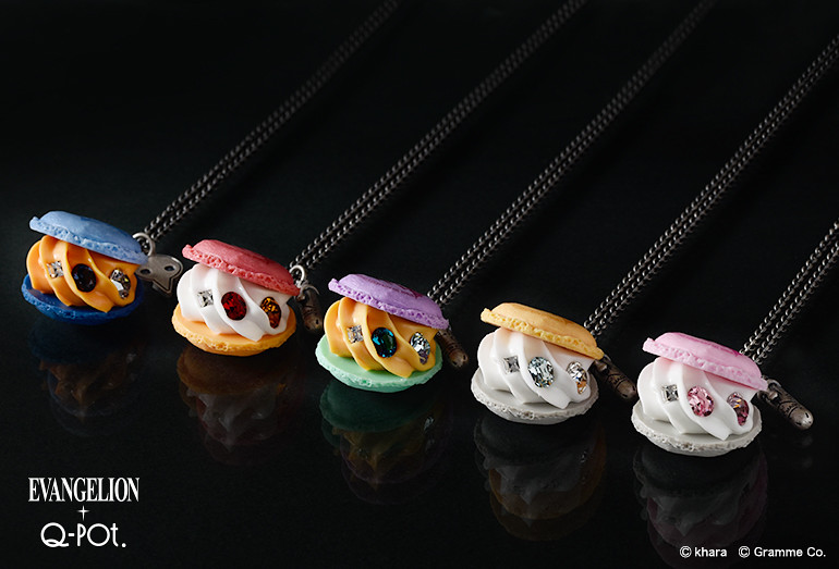 馬卡龍造型的項鍊與吊飾,推出初號機、零號機、貳號機、八號機與由使徒渚薰駕駛的 Mark.06 配色,以兩色馬卡龍餅搭配滿滿的奶油夾心,並點綴施華洛世奇水晶,整體配色充滿個人特色。在扣環部分還有附上駕駛艙插入栓或使徒造型的小吊飾,相當精緻。