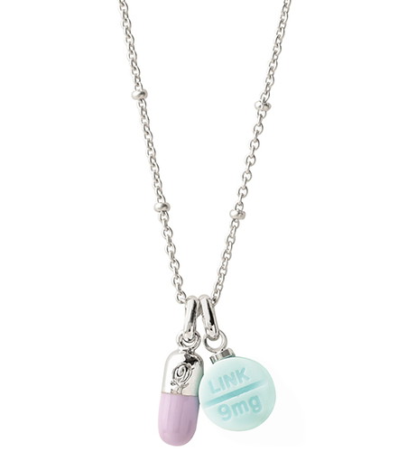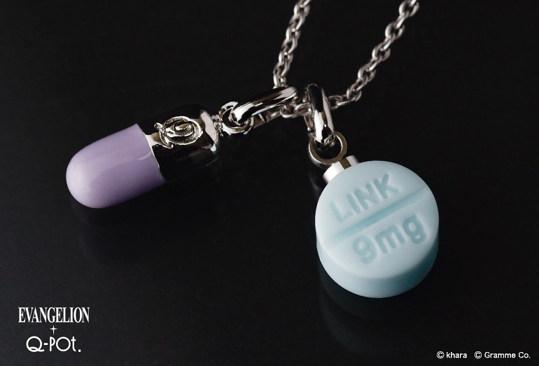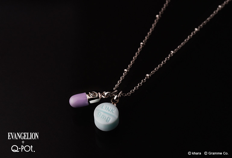 以綾波零為靈感的藥物主題飾品,淡紫配薄荷色,並有「LINK(絆)」與「9(Q)mg」字樣。