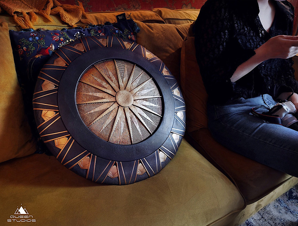 作品包含盾牌與專用底座,整體高度約 58 公分,精緻的細節展現出低調又古典的質感,以閃閃發光的金色與黑色磨砂交錯的獨特造型呈現。內側採用人造皮革的飾帶,可以像亞馬遜英雄一樣佩戴。