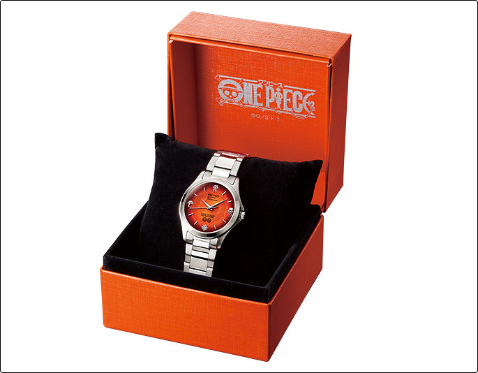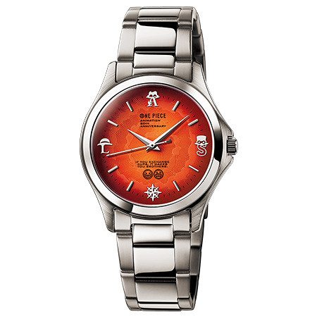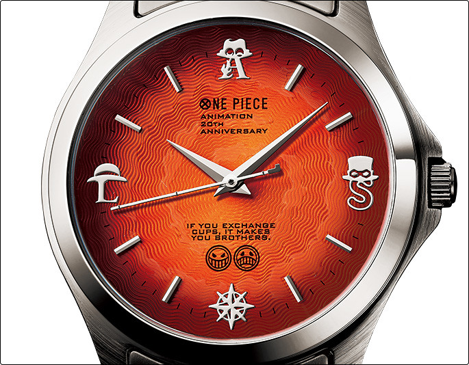 錶盤以火焰橘為主色調,與銀色的錶帶產生明亮的對比;在時鐘的 12、3、9 點位置分別使用了象徵艾斯的 A 字戴著雙人臉帽子與薩波的紳士帽 S 、魯夫的草帽 L,精簡呈現角色形象。6點鐘處則是代表著航海冒險的船舵指針標誌。而秒針細節則是巧妙地使用三兄弟兒時的水管武器為造型。
