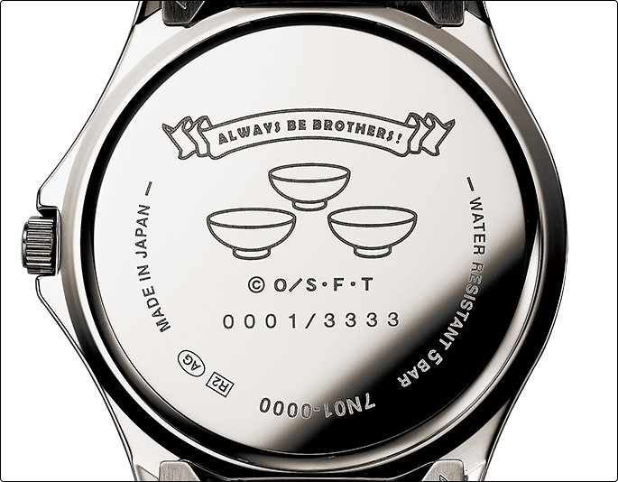除了錶面上成為兄弟的交杯酒的名台詞:「IF YOU EXCHANGE CUPS, IT MAKES YOU BROTHERS」字樣,錶背也是刻上了交杯酒的圖樣,並有限定的數量編號。附有專用的珍藏收藏盒,喜歡航海王三兄弟的玩具人不要錯過。