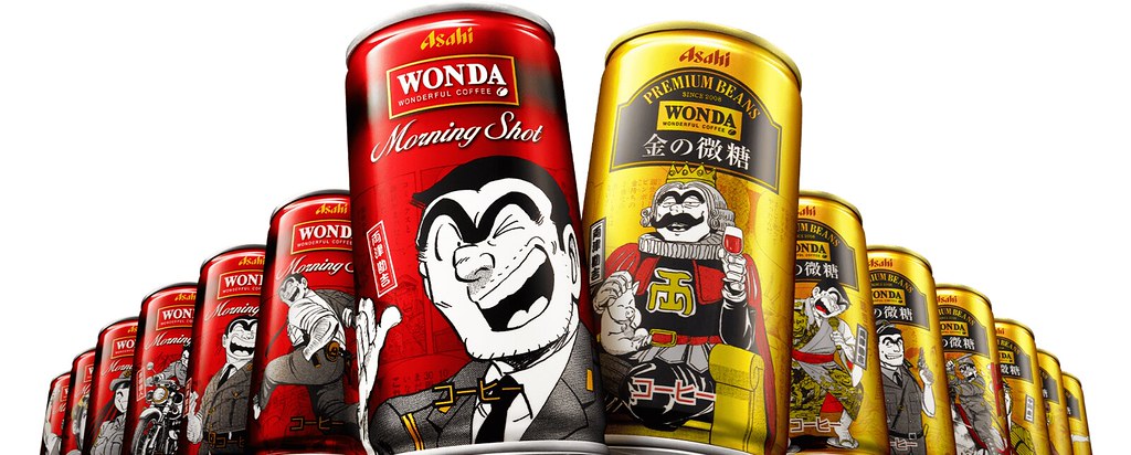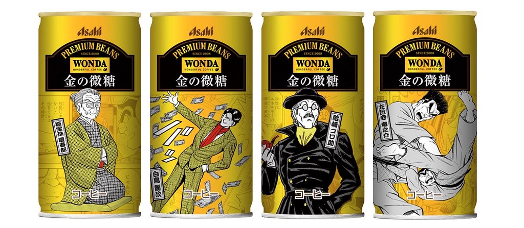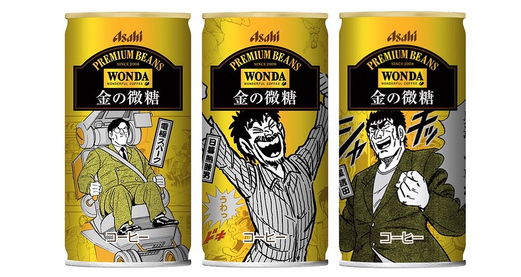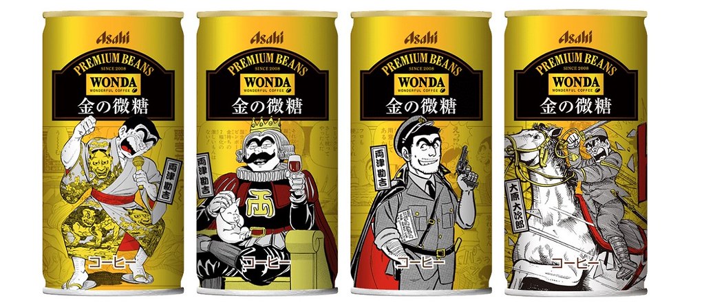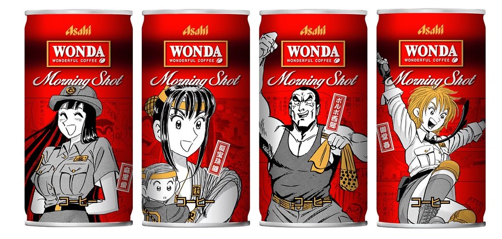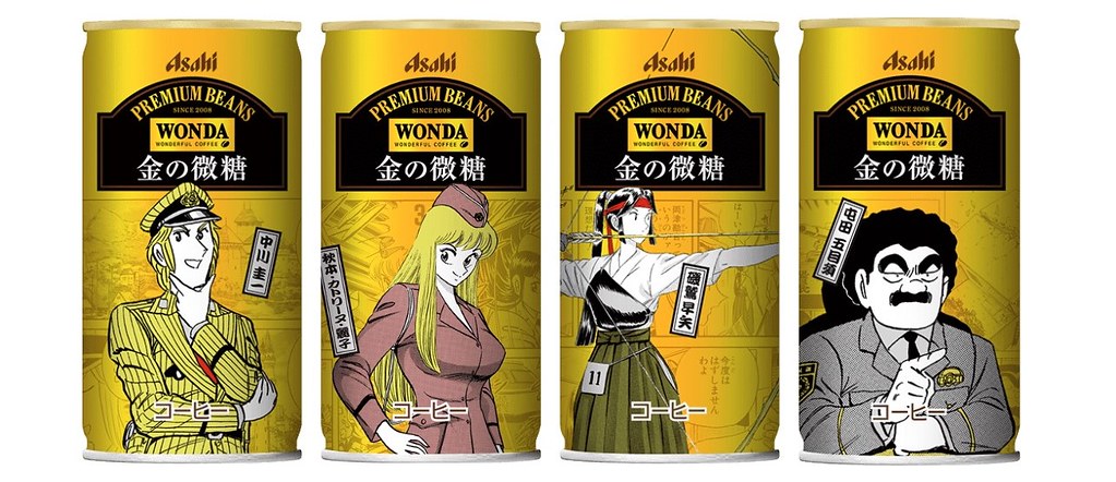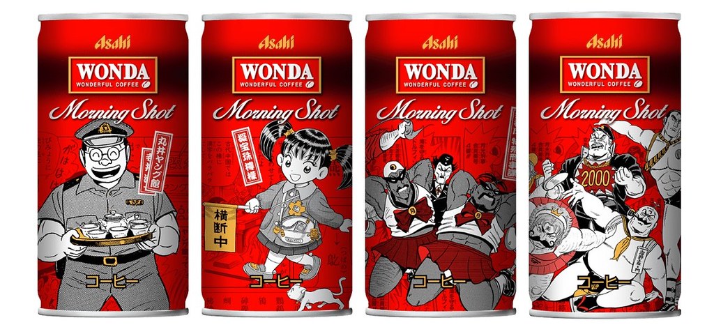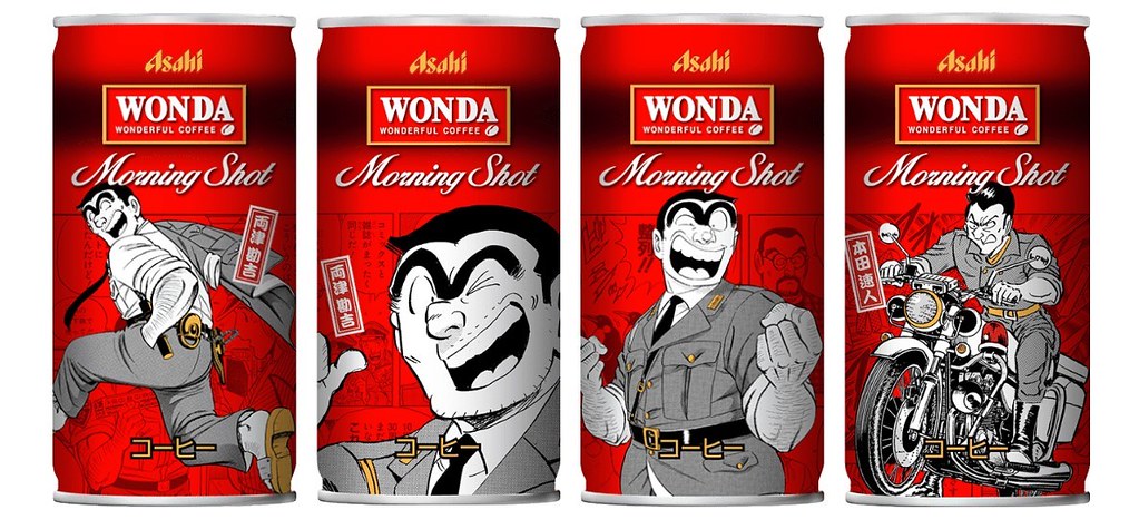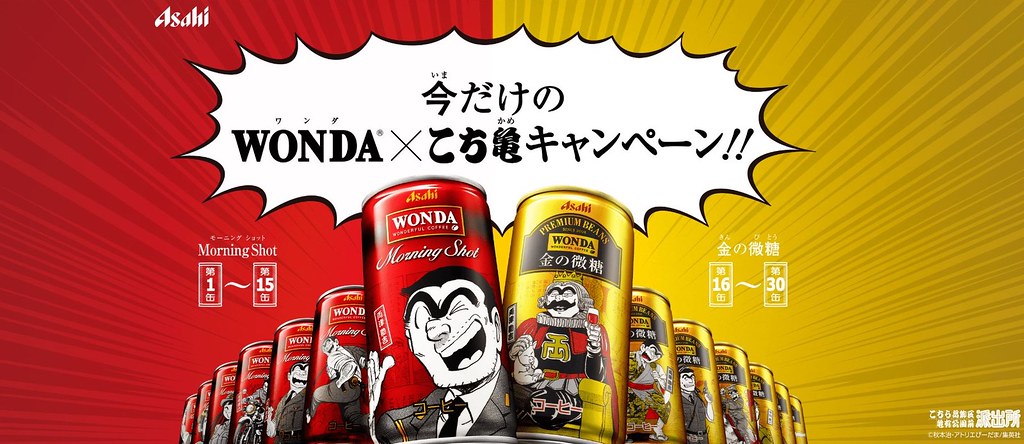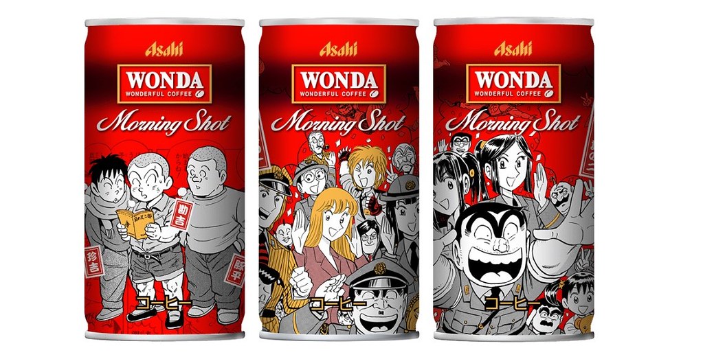 紅色罐裝的 WONDA「早安咖啡」(Monrning Shot)與金色 WONDA「金色微糖」(金の微糖)各推出 15 款限定包裝,從人氣主角兩津勘吉、中川圭一、麻里愛、秋本麗子...到較少見的日暮熟睡男、星逃田、電極史派克等角色都一一登場,更有推出需要兩瓶組合在一起的大集合款式,總數共計有 30 款包裝。