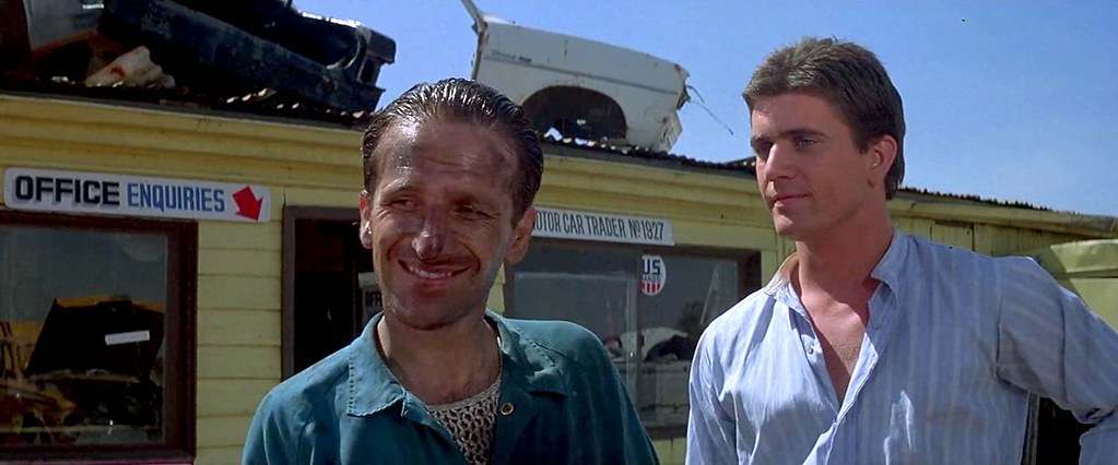 在電影裡,主角是梅爾吉勃遜飾演的「瘋狂麥斯」。其實他在電影裡一點都不瘋狂,大多時候保持安靜的他,反倒看起來有點無言呆。他是公路巡警裡的飛車高手,在文明社會還沒有完全淪落的年代裡,他負責以高超的駕駛技巧,追緝公路上最危險的暴徒。但是當暴徒意外殺害了麥斯的妻小,這位安靜的大個子陷入了安靜的瘋狂:他不發一語地步入警隊車庫,開動了警隊最新研發的秘密武器追緝號,這台警車沒有什麼機關槍或導向火箭等等裝備,它的武器就是速度。而瘋狂麥斯就用追緝號的高速車輪,輾過任何要向他家人之死負責的壞傢伙們。