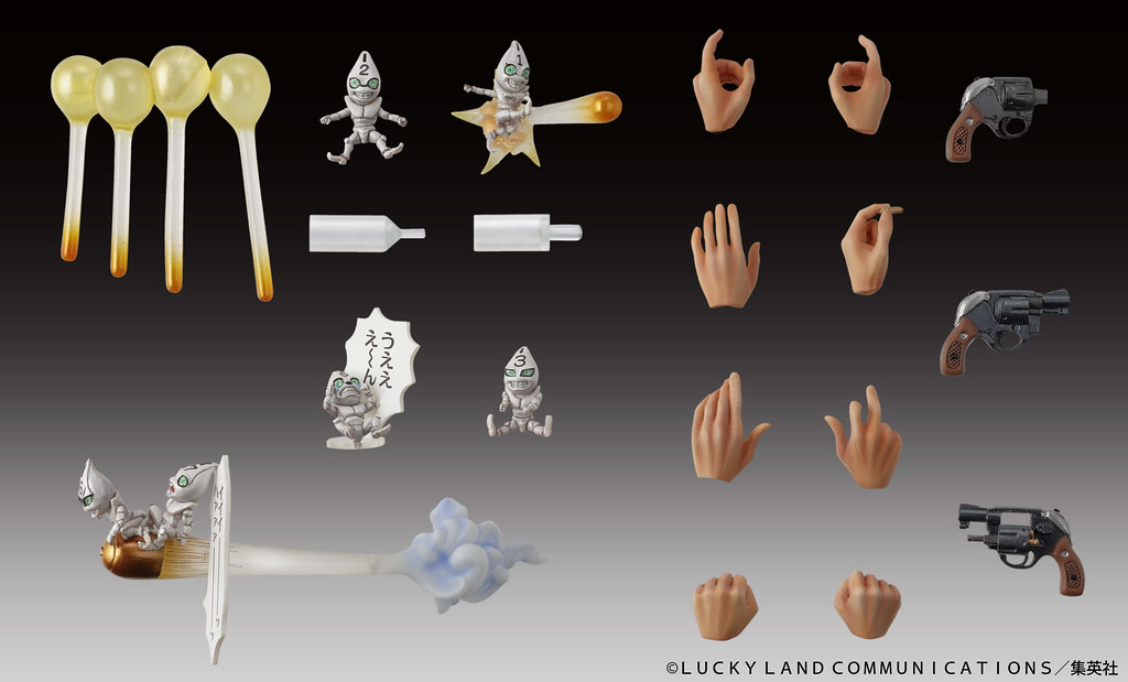 「超像可動 葛德‧米斯達 & 性感手槍」可動人偶,尺寸約為 160mm(性感手槍為 30mm),豐富的配件與精緻的造型設計重現劇中場景。包含普通與張嘴兩款臉部表情,四款可替換的手部零件,與一般手槍、上彈手槍、可以插入褲頭的手槍三款武器;性感手槍們則是分別展露自己的性格,並有將子彈軌道變換自如的特效零件。