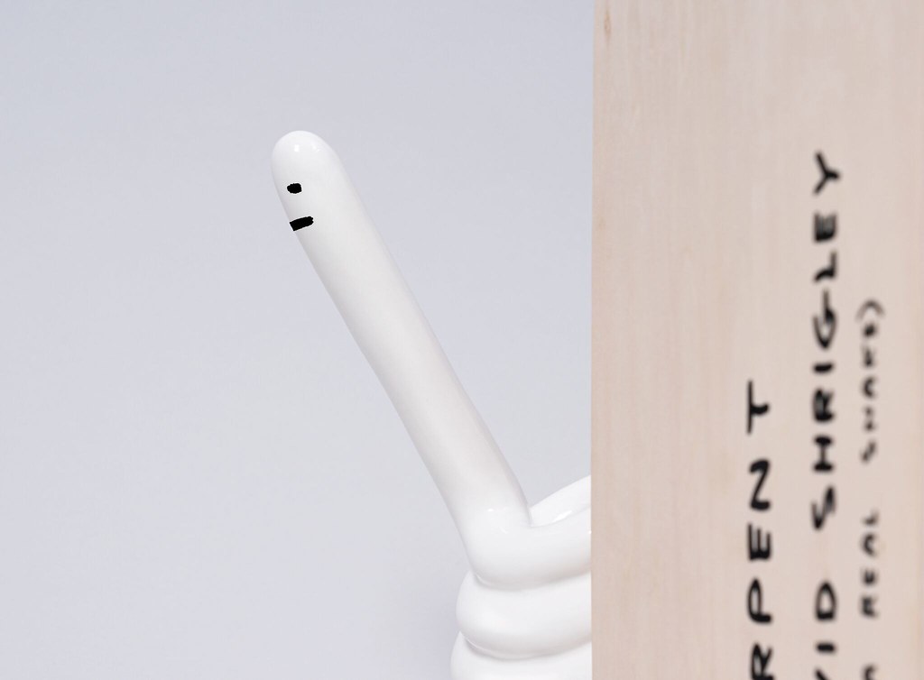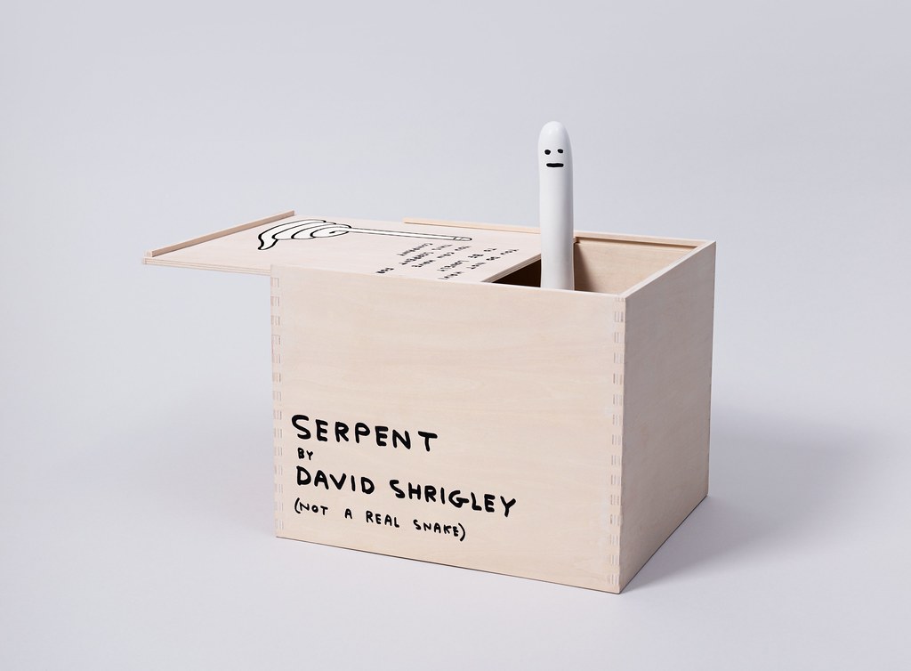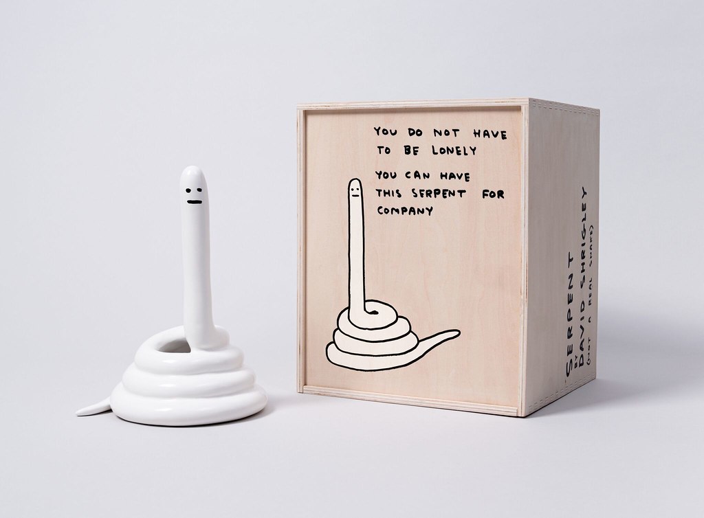David Shrigley 的厭世天鵝雕塑作品《Swan Thing》一直備受追捧於網絡廣傳,這次他推出的全新雕塑《Serpent by David Shrigley》將延續這怪奇荒誕幽默。這隻高 24 公分,呆萌簡約的蛇陶瓷雕塑,顛覆蛇固有的邪惡形象:「大多數文化都視蛇為邪惡陰險的象徵,但這蛇卻代表真誠與積極。擁有這蛇將為家中添上歡樂,並對生活持更正面態度。」印有獨立編號的雕塑將附上由藝術家親筆簽名的認證卡,與木盒包裝。