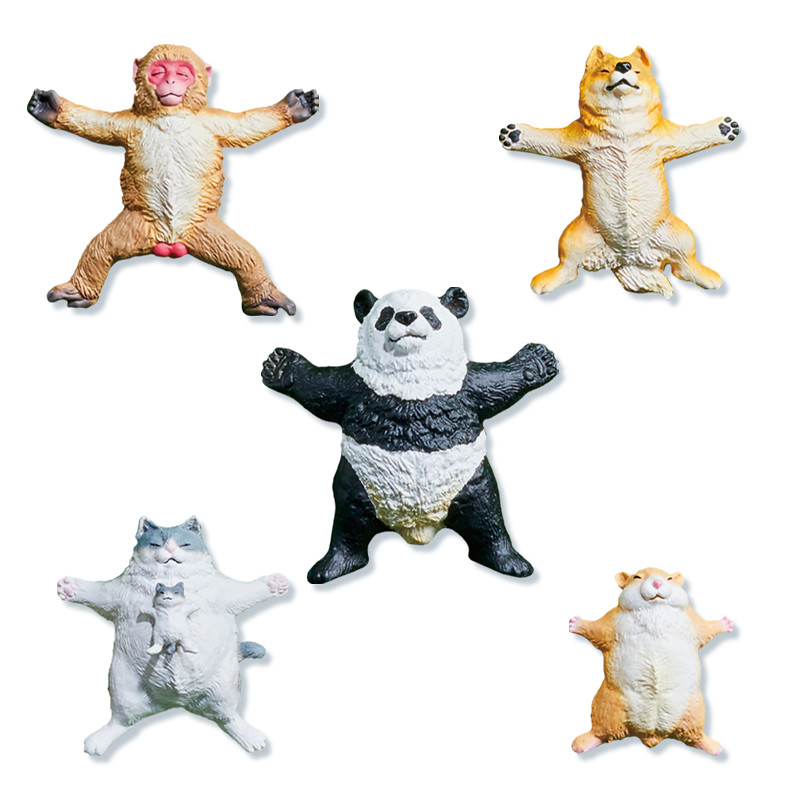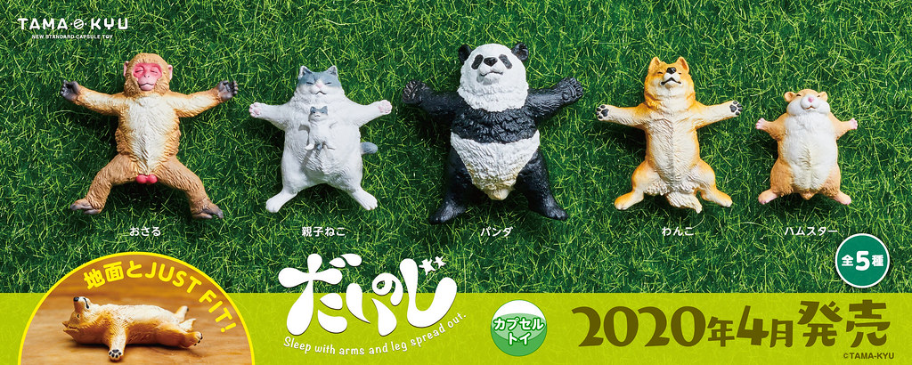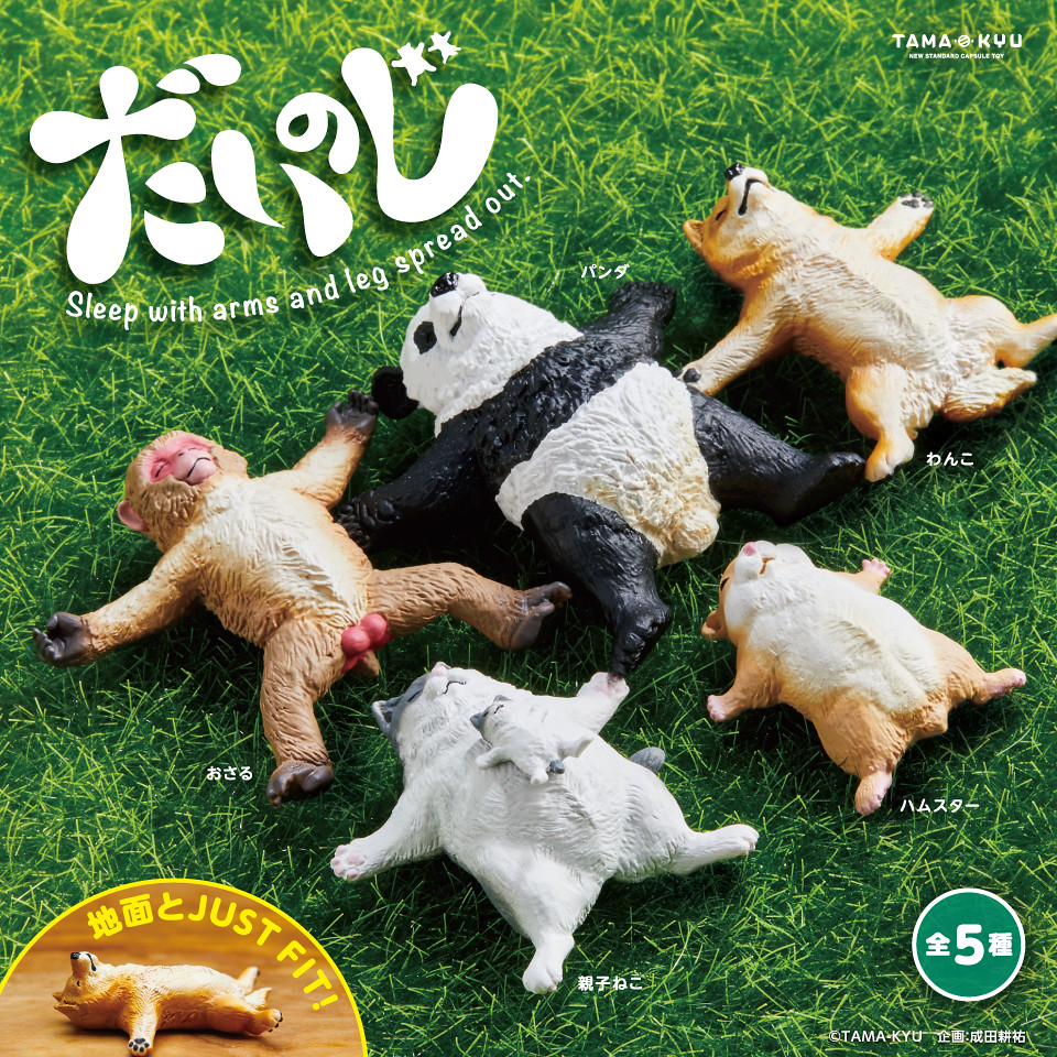 雖然多家轉蛋品牌都曾推出過睡覺動物系列的轉蛋,無論是趴睡、躺睡還是渡辜低頭偷睡,而「大字仰躺動物」則是大喇喇的大字仰躺睡~陣容分別為:狗狗(わんこ)、貓熊(パンダ)、猴子(おさる)、倉鼠(ハムスター)、親子貓咪(親子ねこ)五種款式。