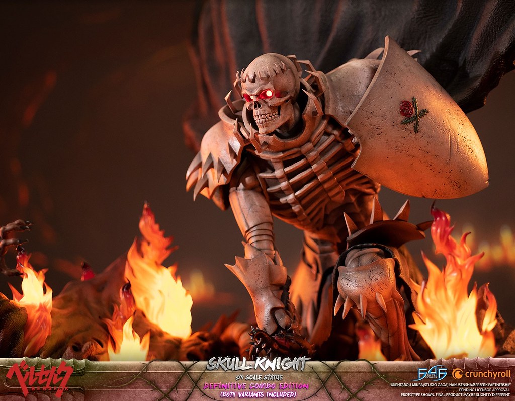 由First 4 Figures所推出的「烙印勇士: 骷髏騎士」1/4比例雕像,尺寸全高約 81 公分(32英寸),以動畫中的場景為靈感設計,從高處降落而飄舞的披風展現了強大的氣勢。底座以遍佈蠟燭與骷髏頭的祭壇為場景。厚重盔甲,手持特有的荊棘玫瑰圖樣盾牌與長劍,刻劃十分細膩,以真實的質感呈現出他整個世紀以來的無數戰鬥。並有黑鐵色與白骨兩種款式。獨家版本在眼睛內置有會發光的LED燈效果。