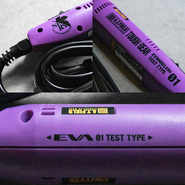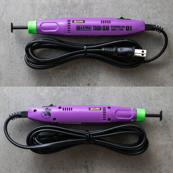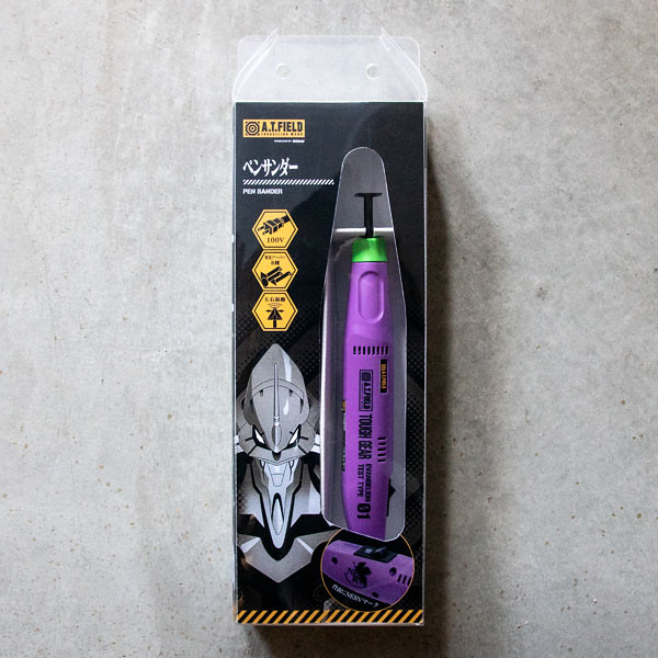 「A.T.FIELD 初號機造型 筆型散打機」以 Kiso Power Tool 代理的德國 PROXXON NO.28594 散打機為基礎,將包裝掛上 A.T.FIELD 品牌,機殼也替換成紫色、螢光綠的初號機配色,並印上 A.T.FIELD 品牌標誌,其餘機能皆與一般版本相同,每分鐘振動次數可達 6,800 次,讓模型玩家在進行打磨作業時可以更省時省力。