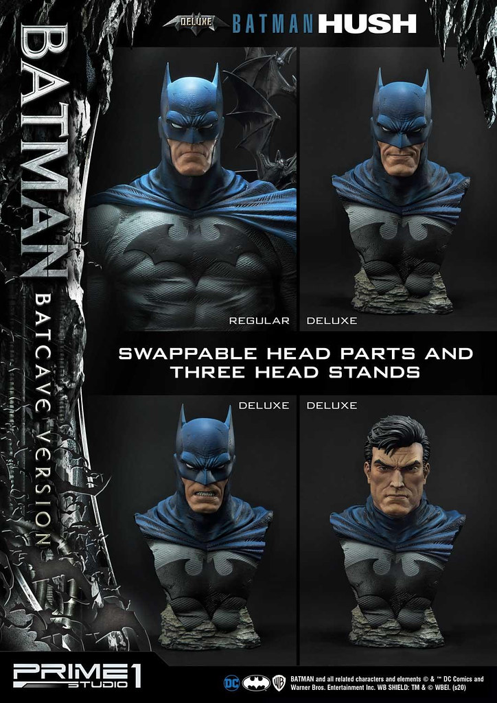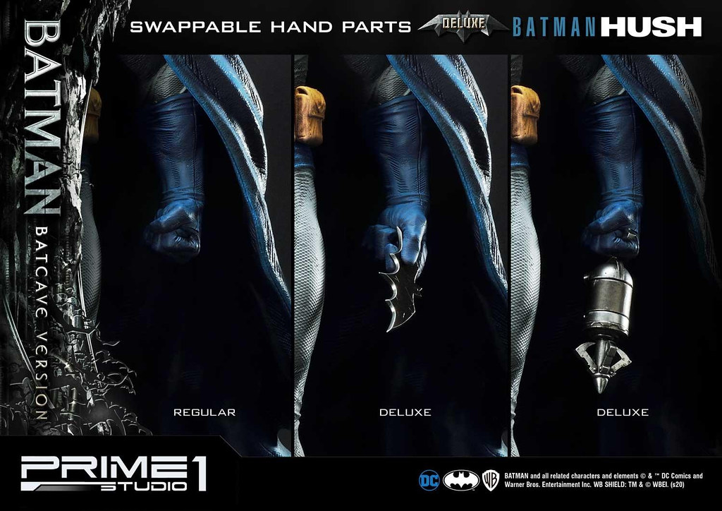 這次的「蝙蝠俠 "蝙蝠洞"Ver」在 DX版中追加了多個替換配件,光是頭雕就再給你微笑、咬牙、裸顏三種,並配備三枚頭雕底座,還有拿著蝙蝠飛鏢、鉤爪槍的兩個替換左手零件,值得一提的是,到 2020 年 5 月 28 日為止,在 Prime 1 Studio 官網訂購本作的 DX版就能夠獲得限定 999 個的纏繞繃帶頭雕。