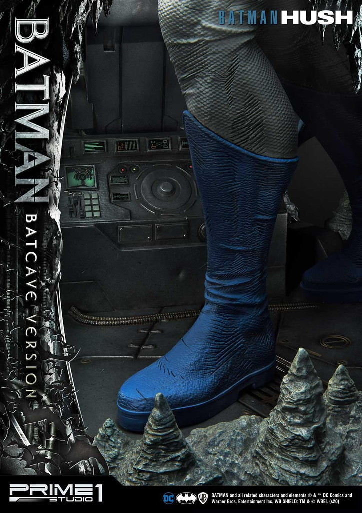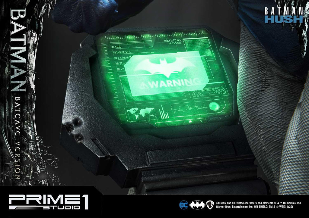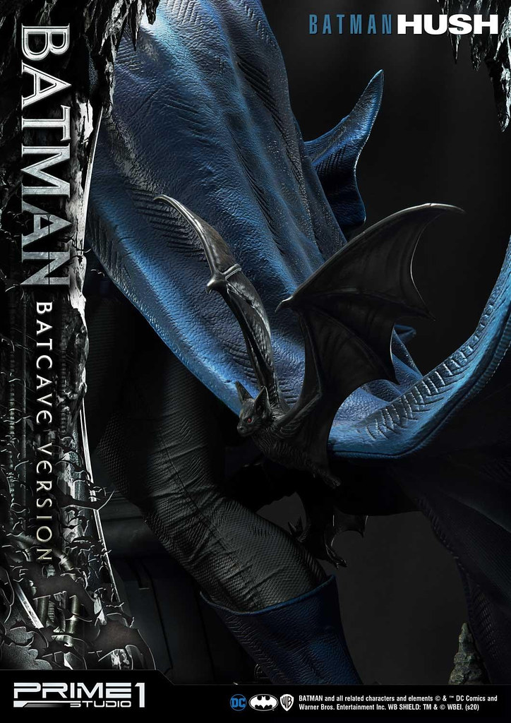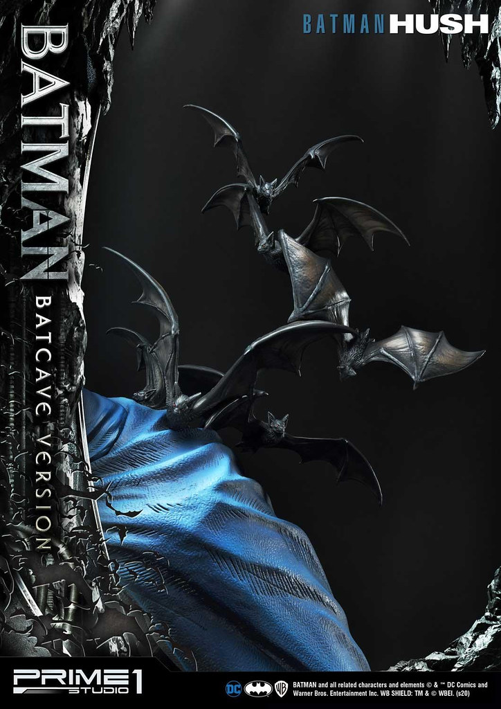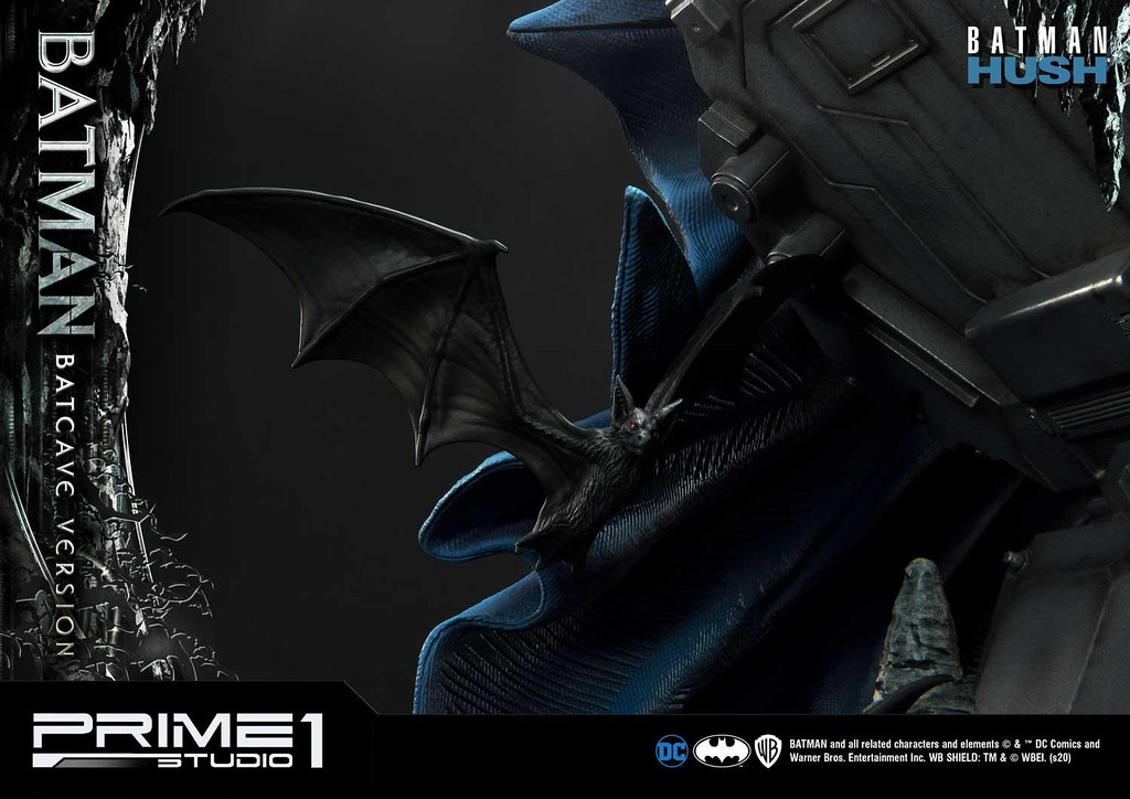 本作高約 87.8 公分,出色地展現了蝙蝠俠邁開腳步離去的姿態,藍灰配色的蝙蝠戰衣、黃色腰帶刻畫出細緻的紋理與皺摺,壯碩結實的肌肉形狀也逼真地形塑,舞動的披風、圍繞在蝙蝠俠身邊飛竄的蝙蝠使這尊雕像富含張力,地台充分展現出設置於岩洞中的基地樣貌,一旁儀器的螢幕還內置 LED 發光功能,整體真的相當帥氣!