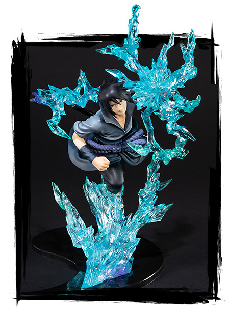 「Figuarts ZERO 宇智波佐助-疾風傳-絆Relation 」,以友情的羈絆為主題,可與同系列的鳴人、我愛羅共同搭配,也可單與鳴人組合。整體尺寸約為 21.3 公分,將使出雷遁忍術的帥氣姿態立體化呈現,服飾的細節、皺摺與揚起的紫色注連繩都有仔細的刻畫。充滿氣勢的雷電透明特效件,搭配向前衝刺的動態感,相當帥氣!