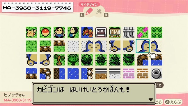 ヒノッチ(@hinopika)便運用「我的設計」系統製作了 47 張貼圖,幾乎完全重現當年 GAMEBOY 主機《精靈寶可夢 金.銀》遊戲中的設計,包含了皮卡丘、紅色暴鯉龍、卡比獸、胖胖路人、各種地面花草樹木,甚至是河道、垃圾桶、柵欄、告示牌等物件,在自己的小島上建設出彷彿故事舞台「城都地區」的世界,能看見鐵路橫貫的繁華城市「滿金市」、捕蟲大賽的舉辦地點「自然公園」、紅色暴鯉龍出沒的「憤怒之湖」等知名場景,令人驚豔。