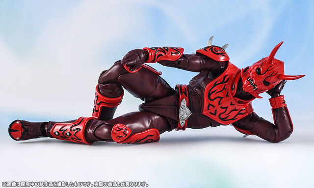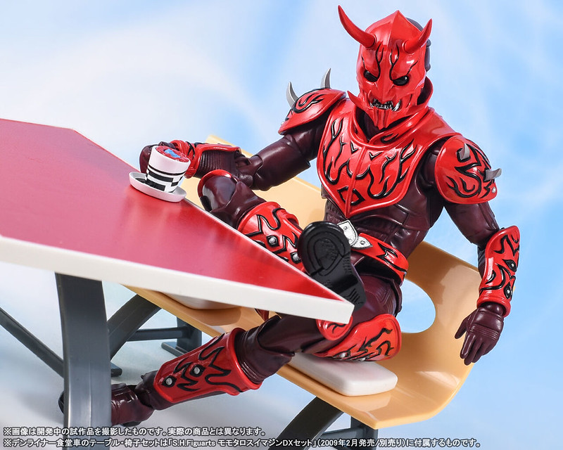 相比 2009 年推出的 S.H.Figuarts 版瘦長的身形,「真骨彫製法 桃太洛斯」忠實還原劇中動作演員穿上戲服的體格,以及紅色盔甲、黑色條紋浮雕、棕色部位的皮革皺摺與縫線等細節,赤鬼形象的頭部也更接近劇中凶狠卻有些可愛的造型。而可動部位的分割設計,則在不破壞造型完整度的情況下賦予高度可動範圍,搭配造型手掌、桃太洛劍、咖啡杯碟等配件,把玩出劇中粗魯有趣的姿勢,或是異魔神版主題曲 MV 裡的舞姿!