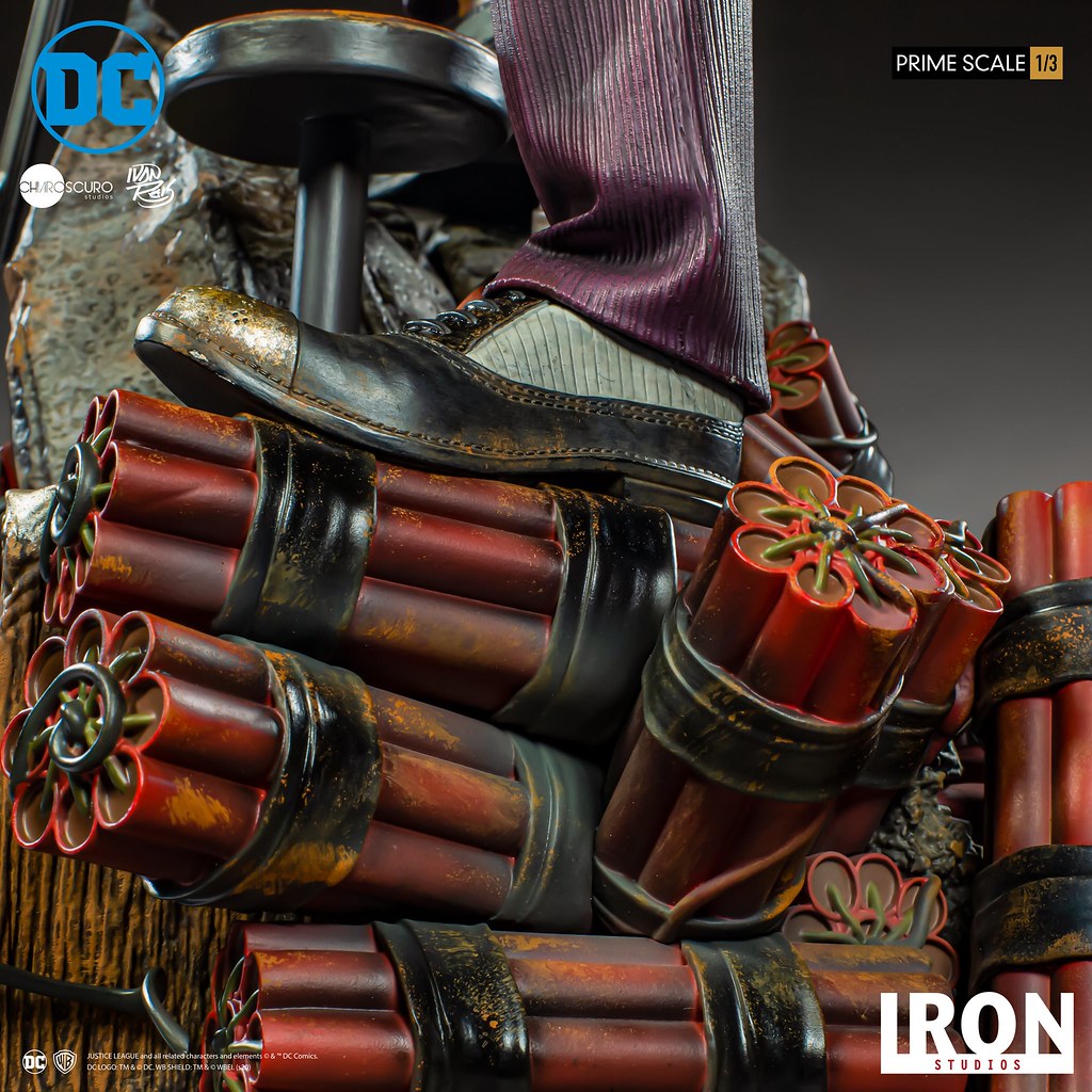 左手高舉拐杖、持槍的右手自然放在彎曲的右腿膝蓋,顯示出犯罪王子面對一切的從容,而服裝的紋路與皺摺、飛揚的後擺、石像的龜裂......等都擁有出色的細節表現,更以精湛的手工上色展現出皮革、石頭、木材、金屬的異樣質地,本作還有附上拿著撲克牌的左手、手握木槌的右手替換零件,在擺滿炸藥的地台中還能發現以 Minico 風格製作的蝙蝠俠驚嚇盒。