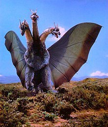 和哥吉拉相同,也是皮套演員進入其中扮演怪獸,由於擁有3個頭、兩條尾外加2對大翅膀,所以為了能靈巧的活動,需要人員25名左右用鋼琴線進行操作,操控極為困難,是東寶特攝怪獸電影全盛時期的象徵。
