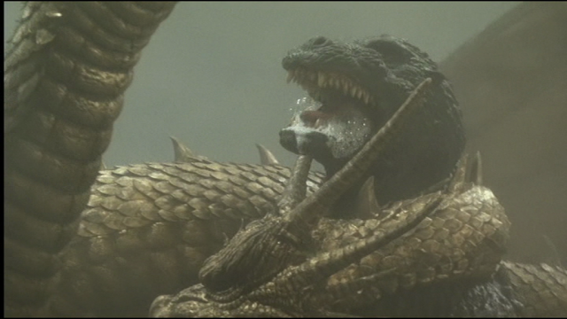 在劇中被哥吉拉從背後捉住脖子,受到安基拉斯的多次擒抱攻擊,然後被哥吉拉連續三次過肩摔而戰敗。