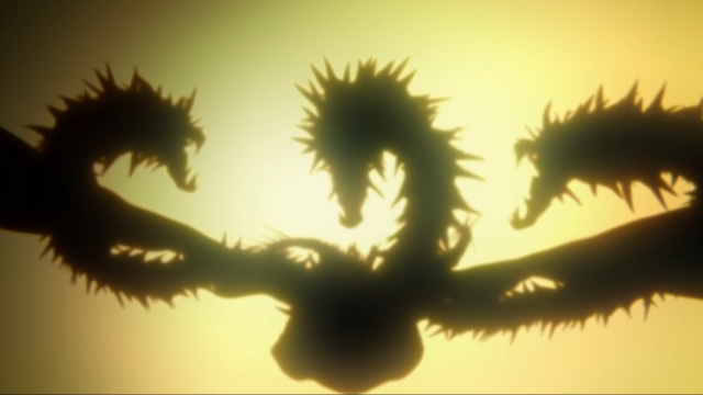 正體不明的神秘生命體,渾身長滿金色鱗片,有著三頭雙尾,尾巴上是巨大的鉤爪,身體彷彿沒有骨骼一樣在半空中扭來扭去。