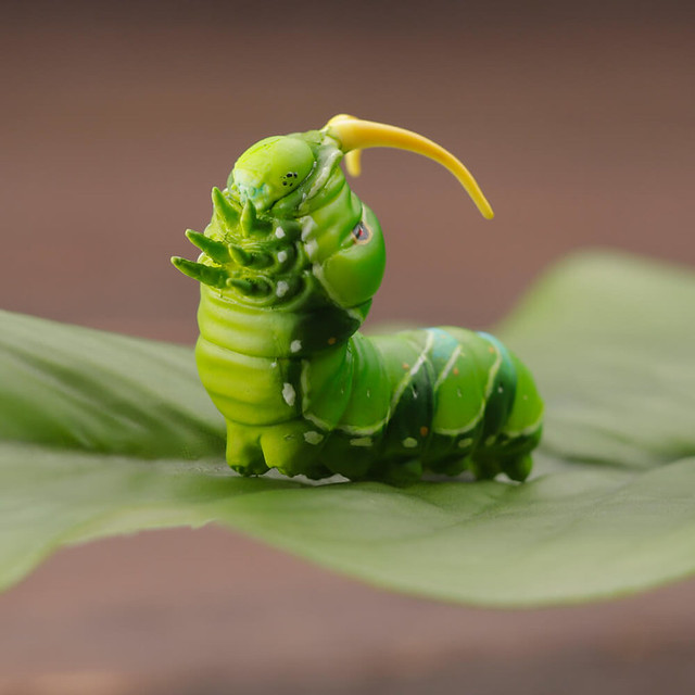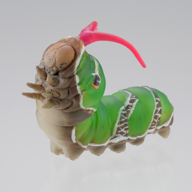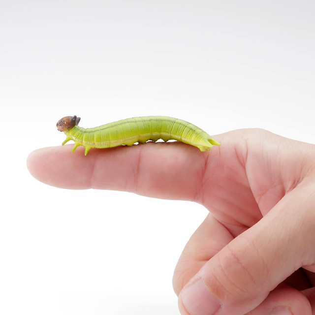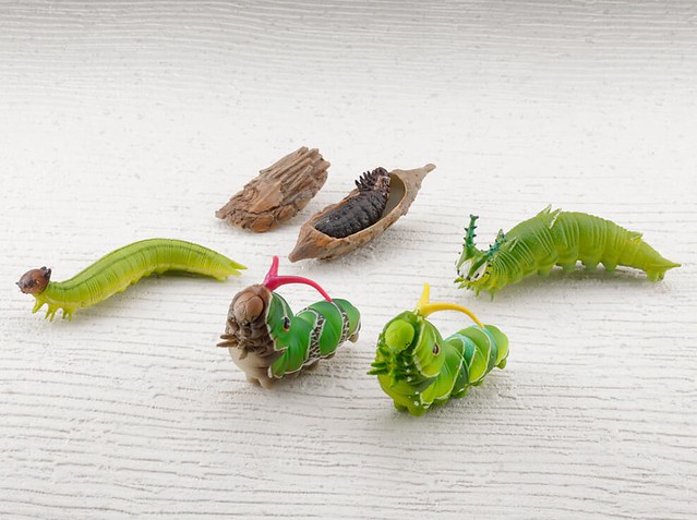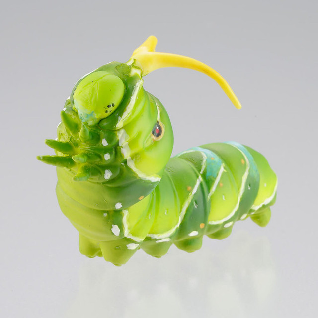 「《膠囊Q博物館》毛毛蟲吊飾收集 4」轉蛋,由松本榮一郎擔任原型製作,以寫實又具有擬真風格將毛蟲樣貌忠實呈現,陣容分別有:柑橘鳳蝶幼蟲、黑鳳蝶幼蟲、有著可愛貓頭造型的稻眉眼蝶幼蟲、一級保育類的日本國蝶大紫蛺蝶幼蟲以及築幼蟲巢的蓑蛾幼蟲,五種具有特色的可愛幼蟲。每一款都以真實大小製作,細膩且還原的塗裝,不仔細看還會誤以為是真的呢!喜歡蟲蟲的玩具人不要錯過~