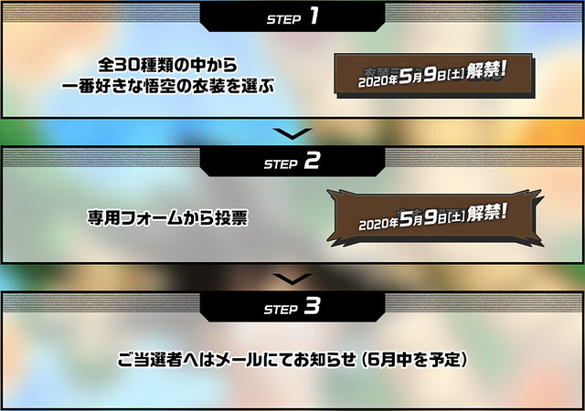 此活動將列出 30 套曾在電視動畫系列(劇場版除外)登場過的悟空服裝造型來舉行人氣投票,獲得第一名的服裝不僅會繪製成全新插畫,更要在 2021 年悟空之日時於推出角色模型!
