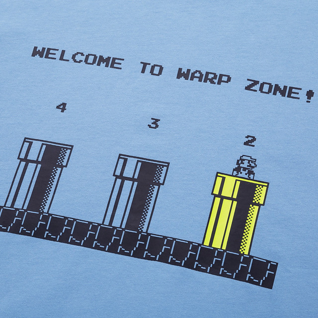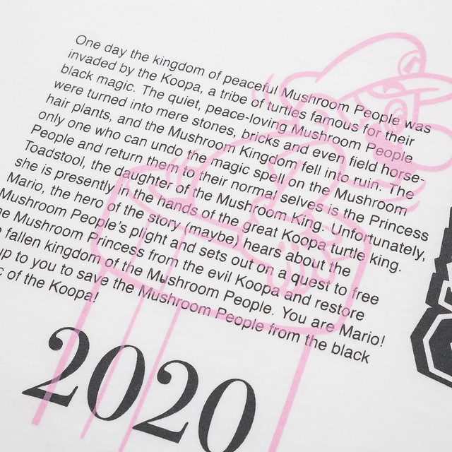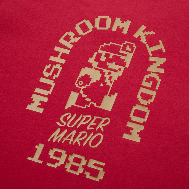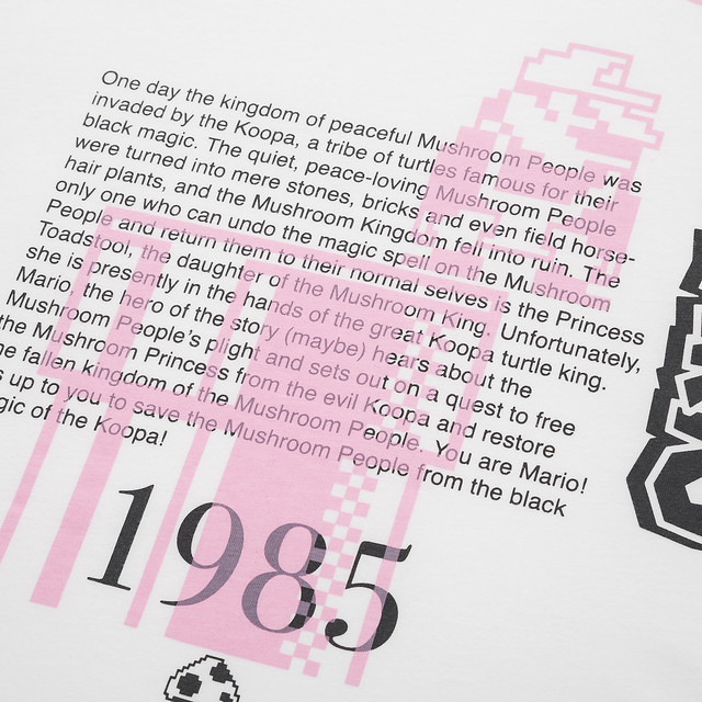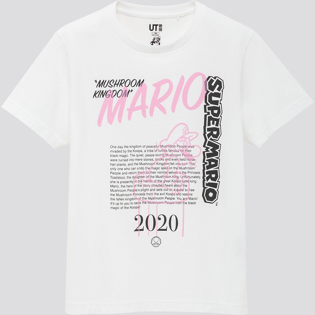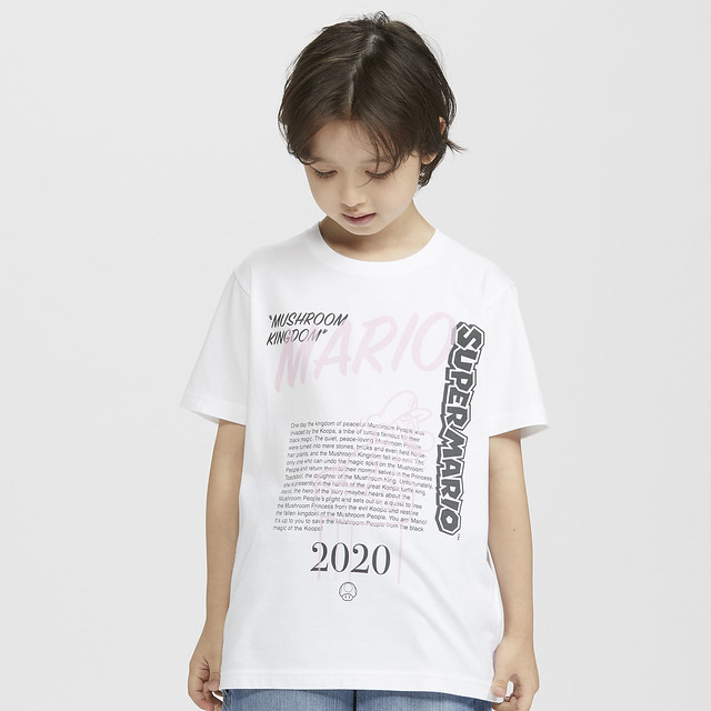 ▼用文字敘述1985年發表的瑪利歐這個遊戲,搭配像素蘑菇圖與瑪利歐經典的水管圖來紀念這個《Super Mario》35週年。與下方的同款童裝呼應,下方的同款童裝則是用2020的年份表現圓滑插畫風的蘑菇圖與瑪利歐。