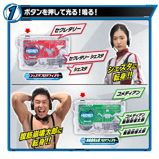 這次推出的「DX Humagear Progrisekey 套組」收錄寄宿了《假面騎士01》前期四名 HUMAGEAR 角色的數據鑰匙(PROGRISEKEY),分別為秘書型AI輔助 HUMAGEAR「謝絲塔(成田愛純飾)」、搞笑藝人型 HUMAGEAR「腹筋崩壊太郎(中山肌肉君飾)」、警備員型 HUMAGEAR「守(吉田悟郎飾)」、壽司職人型 HUMAGEAR「一貫握郎(内野謙太飾)」。