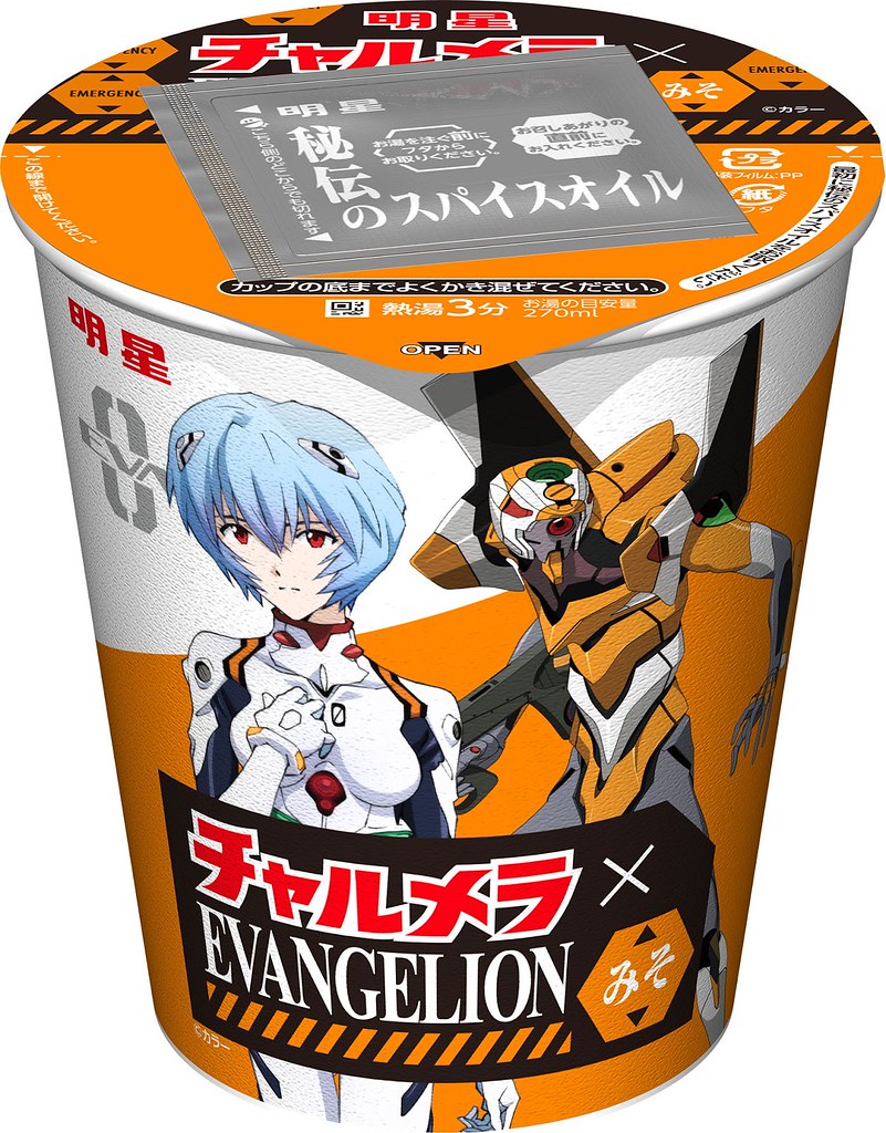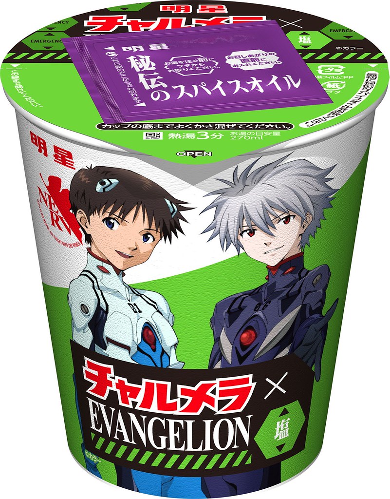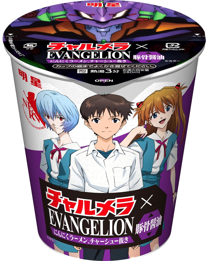 推出結合蒜味的「豚骨醬油」新口味,並以有著三位主角-碇真嗣、綾波零、明日香的《新世紀福音戰士》限定包裝初登場!同時,明星杯裝泡麵的醬油、味噌和鹽味也同步換上合作特裝版,分別有「明日香-醬油口味」、「綾波零-味噌口味」、「真嗣&渚薰-鹽味」三款,每一款杯麵包裝背後還有明星泡麵吉祥物老爹與黑貓致敬福音戰士劇中名場景的可愛圖片,小巧思讓粉絲會心一笑~