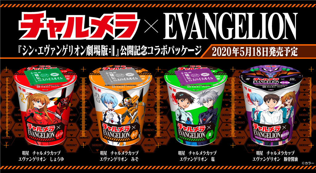 日本受武漢肺炎(新型冠狀病毒;COVID-19)影響,原計畫於 2020 年 06 月 27 日上映的《新·福音戰士劇場版:│▌》延期上映,但是相關的合作搶錢活動仍如期展開!日本知名泡麵品牌「明星」,將推出與人氣動漫《新世紀福音戰士》合作的限定杯麵包裝與新口味「明星杯麵 福音戰士豚骨醬油」口味(暫譯,明星 チャルメラカップ エヴァンゲリオン 豚骨醤油),預計於 2020 年 5 月 18 日在日本發售。