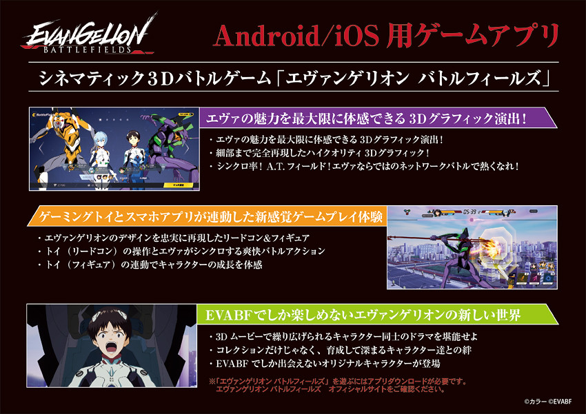 將《新世紀福音戰士》的世界以高品質 3D CG 美術完整重現的手遊新作《新世紀福音戰士 BattleFields》(エヴァンゲリオン バトルフィールズ)為一款 3D 動作對戰遊戲。除了有原作中經典的作戰要素,還加入了可以培育自己喜愛角色的養成、第三新東京市進行復興的經營策略等內容,並有遊戲版原創角色,讓玩家體驗全新的使徒戰鬥故事!