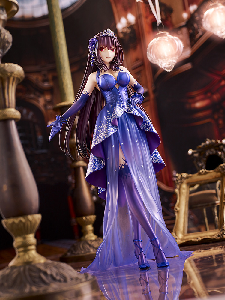 此次立體化的「Lancer/斯卡薩哈 英靈正裝ver. 1/7比例模型」基於遊戲中概念禮裝插畫製作,運用多種光澤的紫色、透明零件表現出布面、薄紗的材質差異,並印上群星般華麗的十字紋樣。而頭冠、花朵造型的髮飾項鍊也有相當精緻的細節,搭配造型躍動的長髮、優雅的姿勢展現絕美的英靈正裝造型。