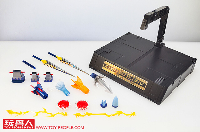 ▼ 接著來介紹武裝和台座部份。孔巴特拉 V 的特色之一就是多到不行的武裝,從「超電磁溜溜球」、「超電磁龍捲風」、「超電磁迴旋」...等運用超電磁能源的系列武裝,到「原子燃燒器」、「熱線砲」、巨大飛彈「BIG BLAST」...等火器,20 多種武裝讓人眼花撩亂。這次 GX-90 也附上其中幾種經典武裝,甚至也配合 F.A. 版重新調整新造型,配合超高度可動把玩。