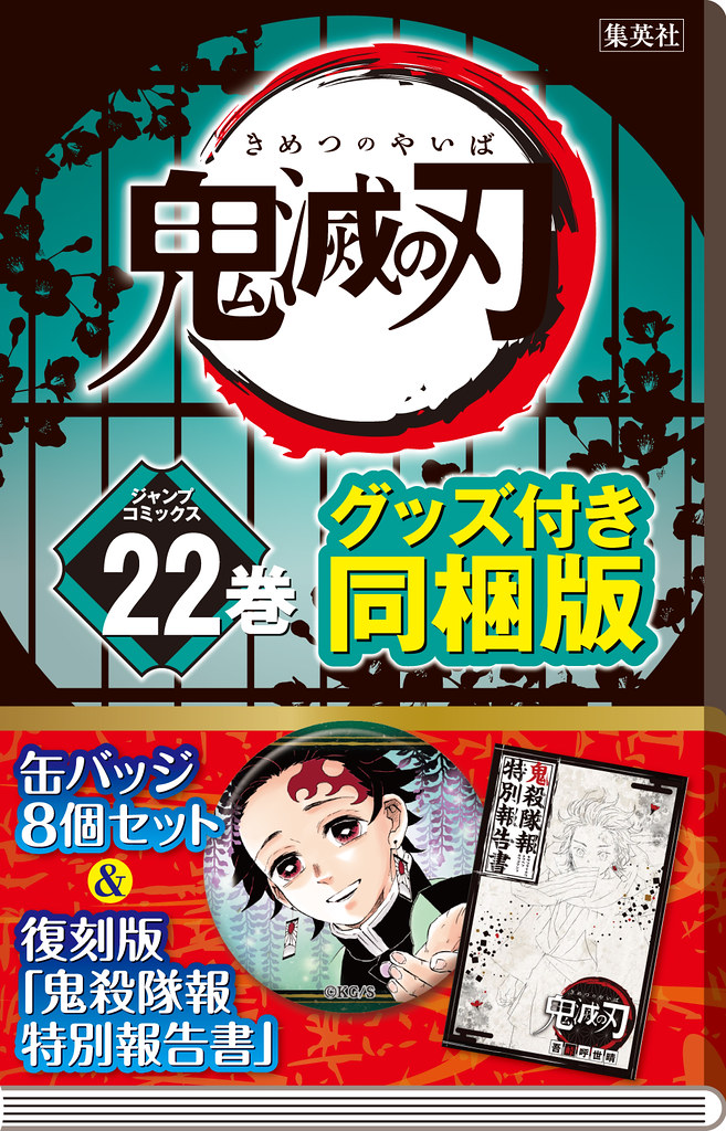 ▼單行本第22集同捆附錄為「鬼殺隊報 特別報告書」與8款徽章