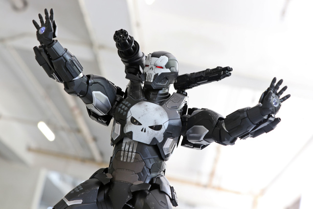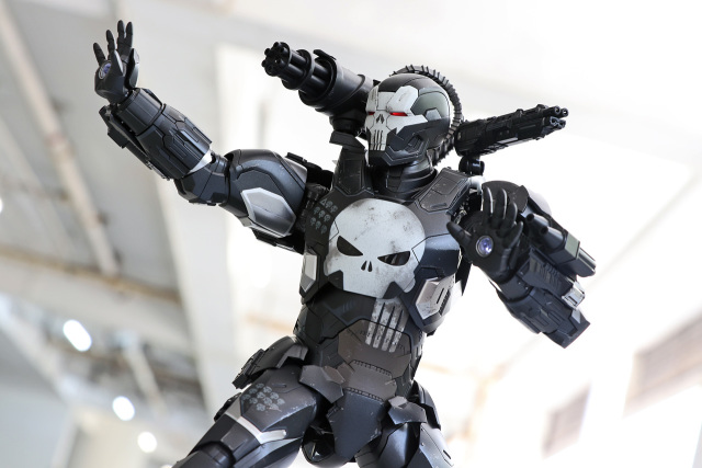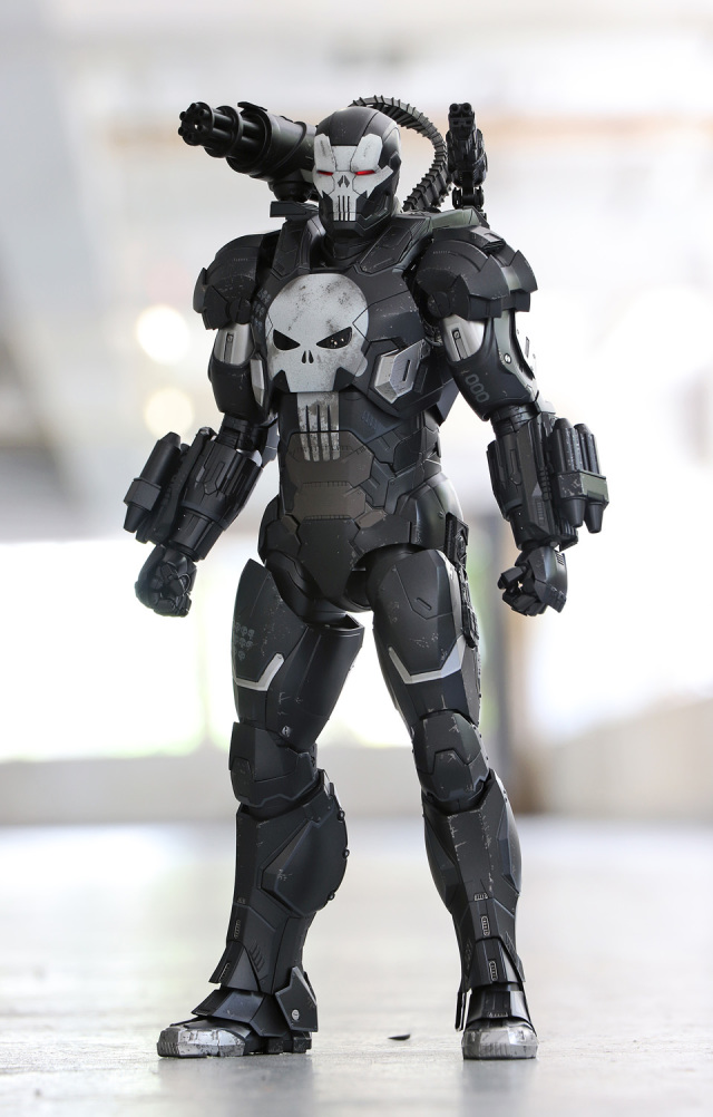 主體高約 32.5 cm 及超過 30 個可動關節,成形色以黑色、深灰及銀色為主,全身印有不同的舊化和戰損痕跡及其專屬的白色骷髏圖案。配件主要包括 Frank Castle 的頭盔頭雕、3 對可替換手掌、四組分別安裝於肩膊機關炮和前臂機關槍上的黃色火焰特效件和專用地台等。本體 Arc Reactor 連同頭盔雙眼及雙掌皆設有 LED 燈,雖然心口位置你是用不著的...... 武器方面,除了保留了戰鬥機器原有的一支可調校不同角度的重型機關炮、一對安裝於前臂內側的飛彈及藏於胸部裝甲內的飛彈之外,還特別配備上一把重新設計的肩膊重機關槍連子彈帶及一對安裝於前臂上的二連機關槍等等。