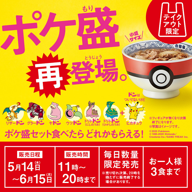 日本知名牛丼連鎖餐廳吉野家今(12)日宣佈,去年熱賣到一週就被搶空、與超人氣電玩遊戲《精靈寶可夢》的合作活動將於日本時間 2020 年 05 月 14 日 11 時~06 月 15 日 20 時期間再次登場,屆時日本全國吉野家連鎖店會以外帶方式(TAKE OUT)開始販售特別的「寶可盛套餐」!(部份店家無販售。)