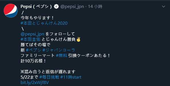 昨日(12日),知名酒品企業三得利在推特上舉辦了「與本田猜拳2020」。參加者必須與日本足球選手本田圭佑進行猜拳比賽,贏的人可獲得「百事 日本可樂 600ml」的兌換卷,名額只有10萬名,而舉辦期間到5月23日晚上11點59分為止。