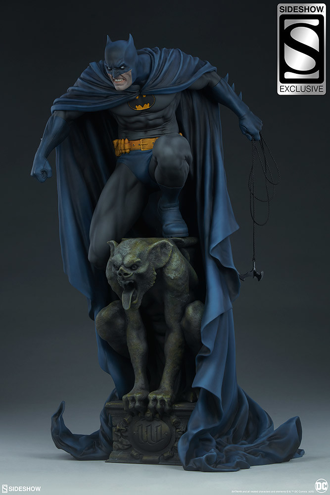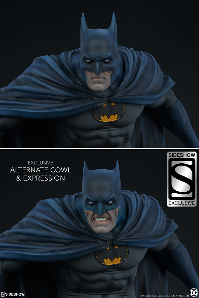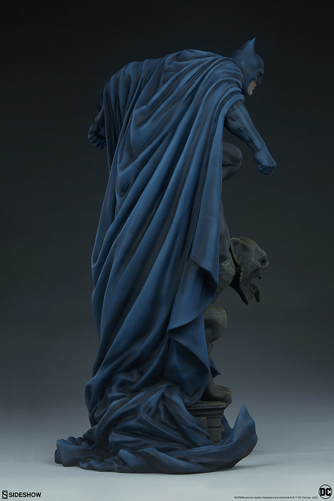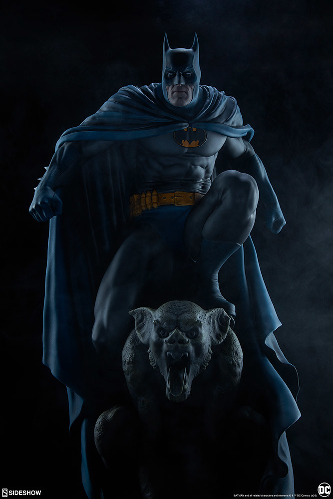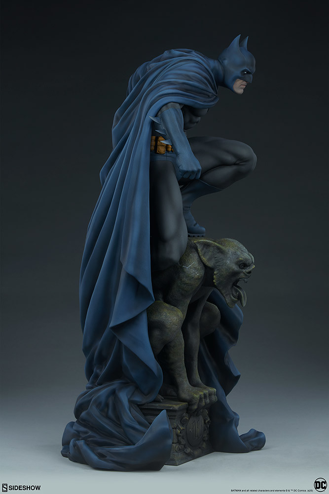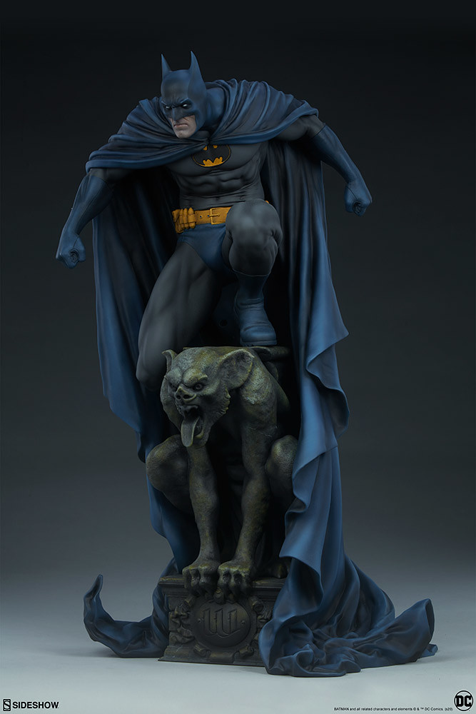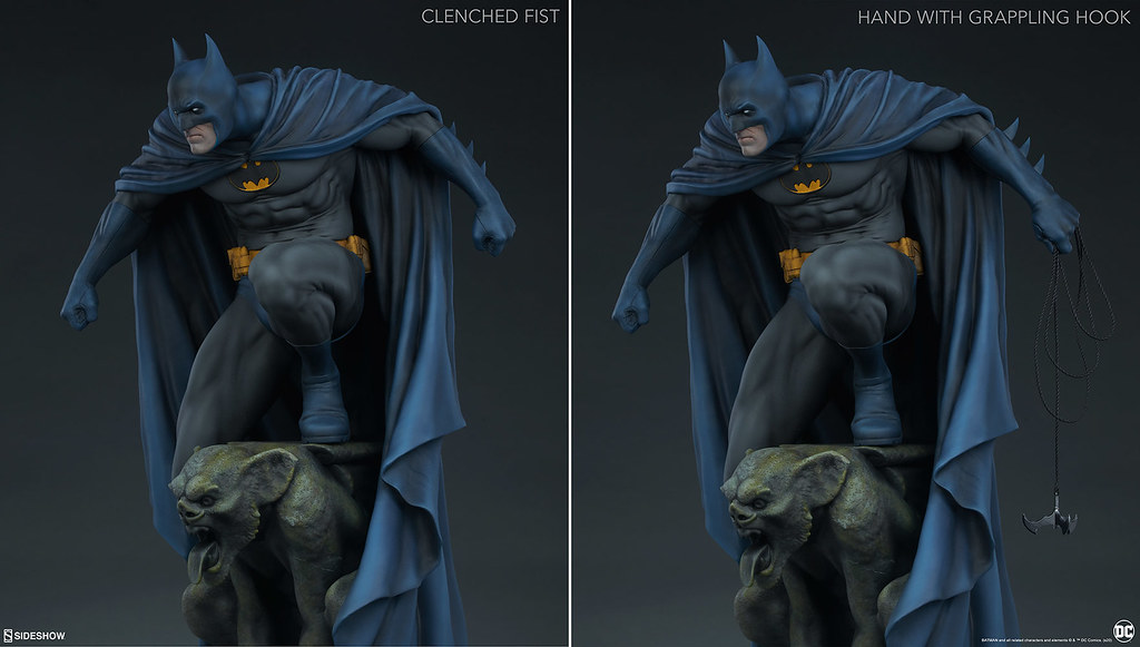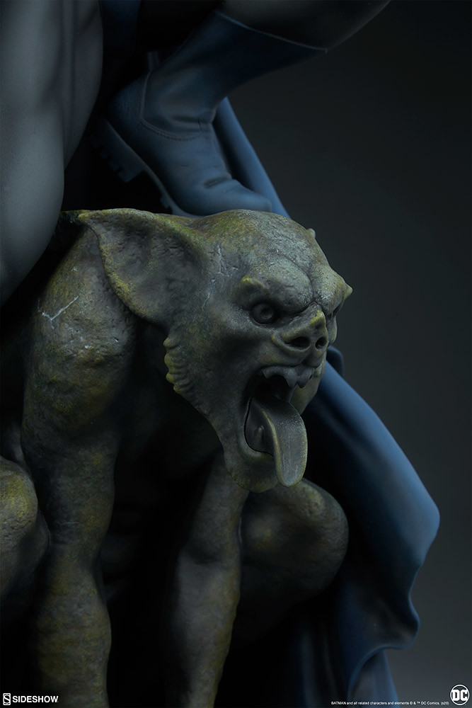 本作高約 57 公分,蝙蝠俠以蹲踞姿態踩在滴水嘴獸上頭,藍灰配色的蝙蝠戰衣、胸腹與大腿的肌肉線條皆施以細緻的雕刻,陰影與豐富的寫實皺摺不但表現出深刻的立體感,也讓蝙蝠俠帶有一股沉重魄力!左臂的部分有空手與拿著蝙蝠鉤繩兩種狀態可以選擇,EX版更追加了一顆呈現咬牙神情、蝙蝠耳朵較短的頭雕能替換,與下方大吼的滴水嘴獸搭配,十分兇狠、暴力。