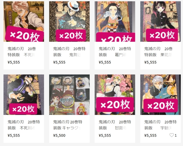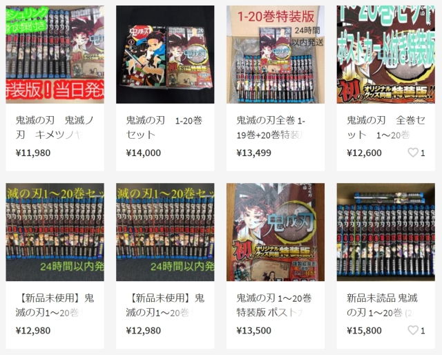 在日本的購物網站,像是樂天、ヤフオク!(Yahoo拍賣)、メルカリ(mercari)等平台上,20 卷特裝版的定價也被炒高到 5000 日圓(原定價900日圓),甚至還能看到 1~19卷+20卷的特裝版SET轉賣價突破六萬日圓的價錢,此現象真的是非常之誇張。