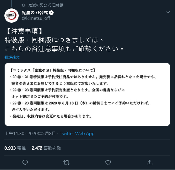 當然在《鬼滅之刃》官方推特於同月 8 日的注意事項中也提到:「20卷和21卷不是預約受注的商品。發售後如果遇到斷貨的情況下,請各位讀者耐心等候再版。」