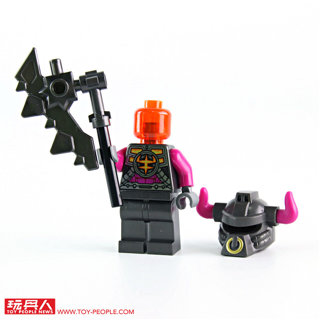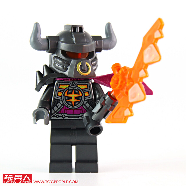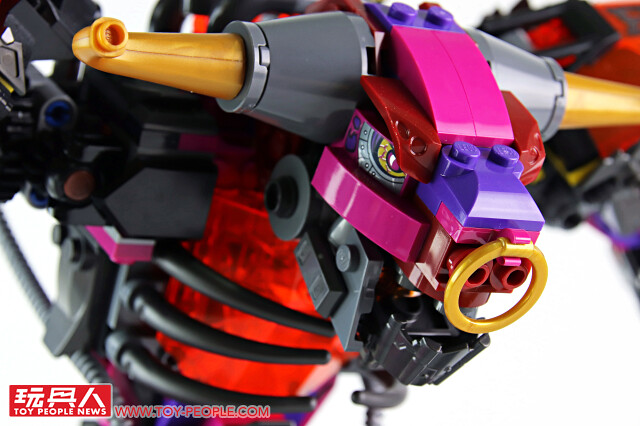▼ 來個頭部特寫,有著明顯血絲的雙眼帶有強烈氣勢,加上鼻環、可開闔的嘴巴,高度還原了神話中的牛魔王形象,美中不足的是頭部並沒有設置卡榫件,單單是靠著胸前那塊大片的半透明橘色磚,因此頭部只會有一個角度,只能以身體的傾斜度來調整。