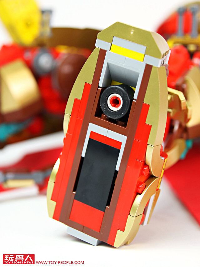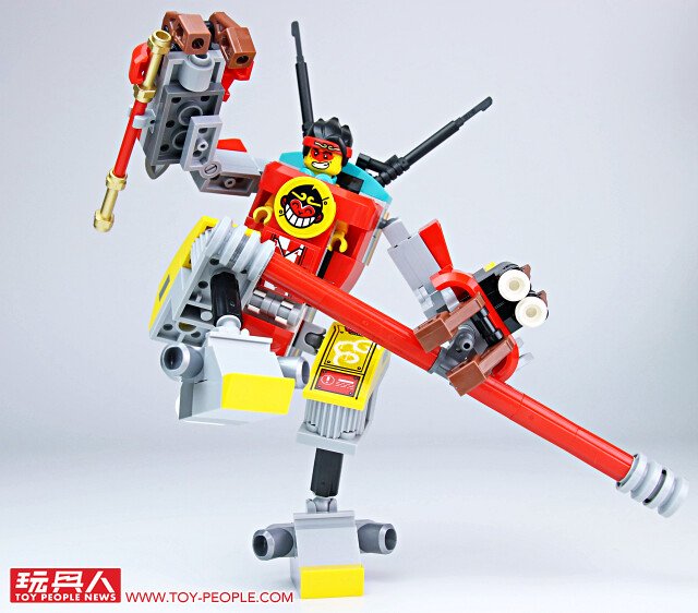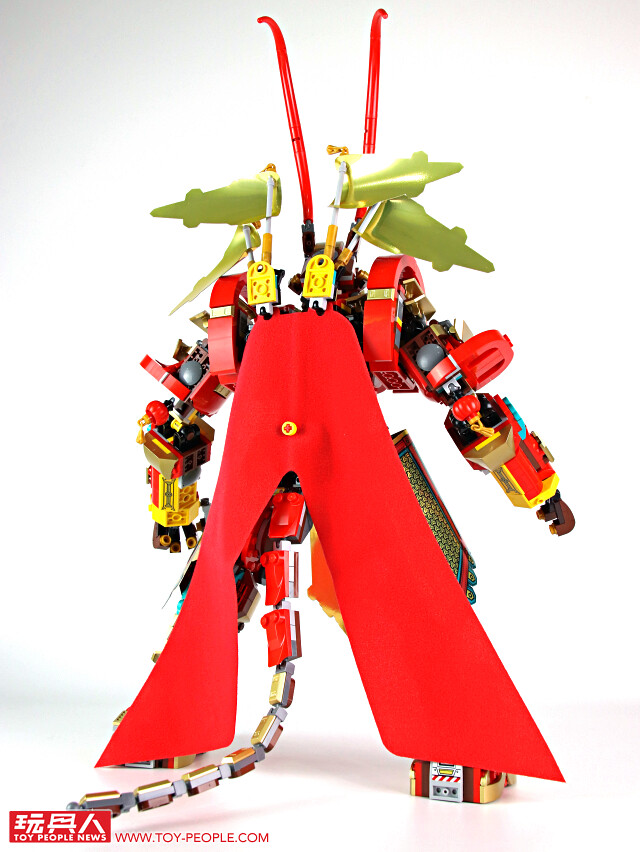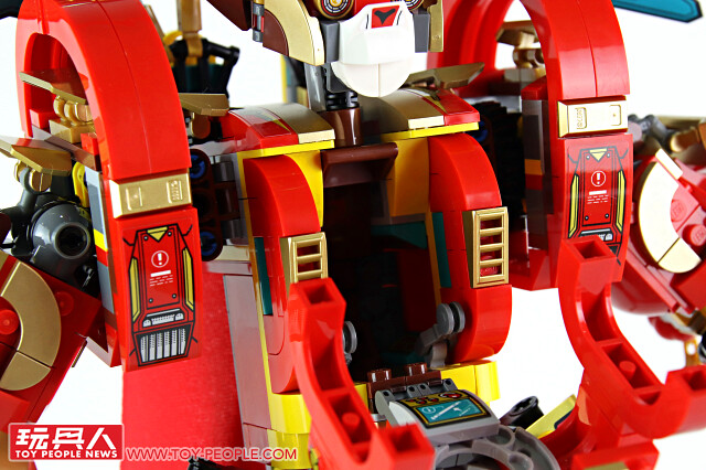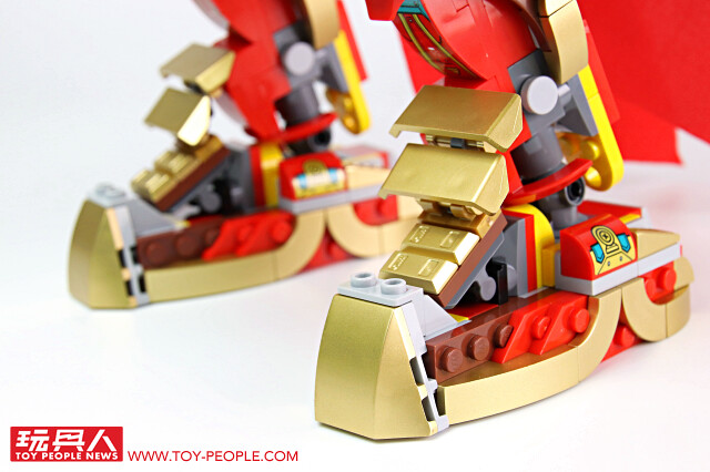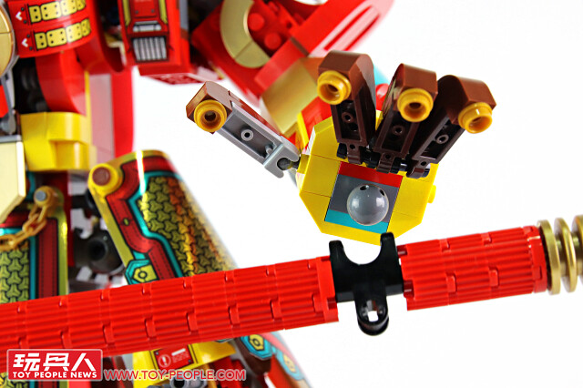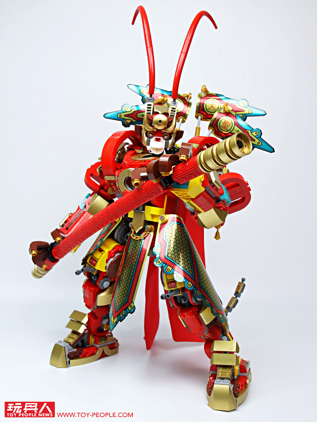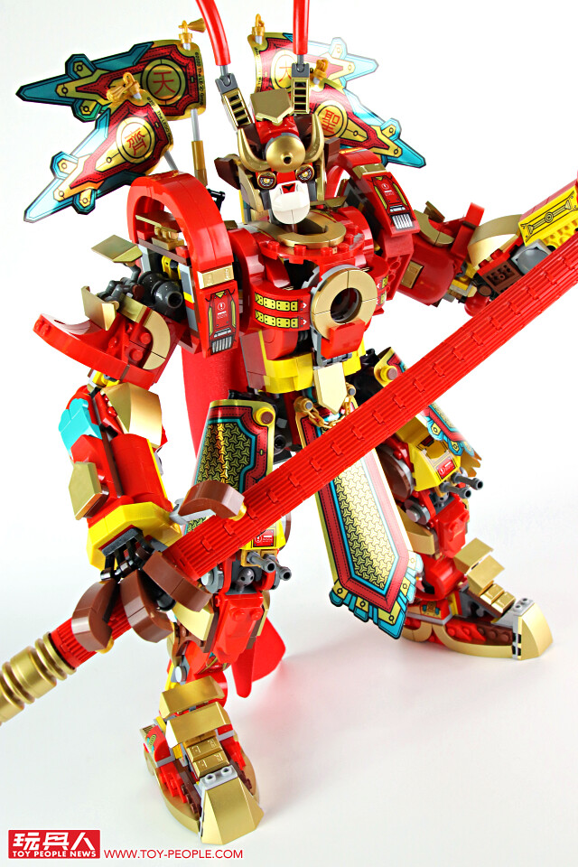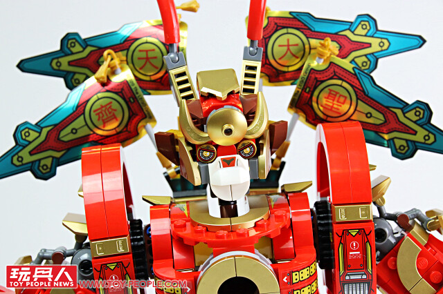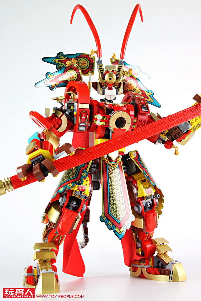 ▼ 先來看這套的重點「齊天大聖黃金機甲」,組裝完成之後的份量、重量都相當足夠,並充分將齊天大聖與機械裝甲結合,打造出以耀眼金色零件點綴紅色盔甲的華麗作品;雖不是可動玩具卻仍能以科技磚的卡榫設計達到足夠的可動性與接地性,造型部分更是利用豐富的貼紙、布料披風、裙甲(塑料軟片)修飾,整體來說真的非常帥氣!
