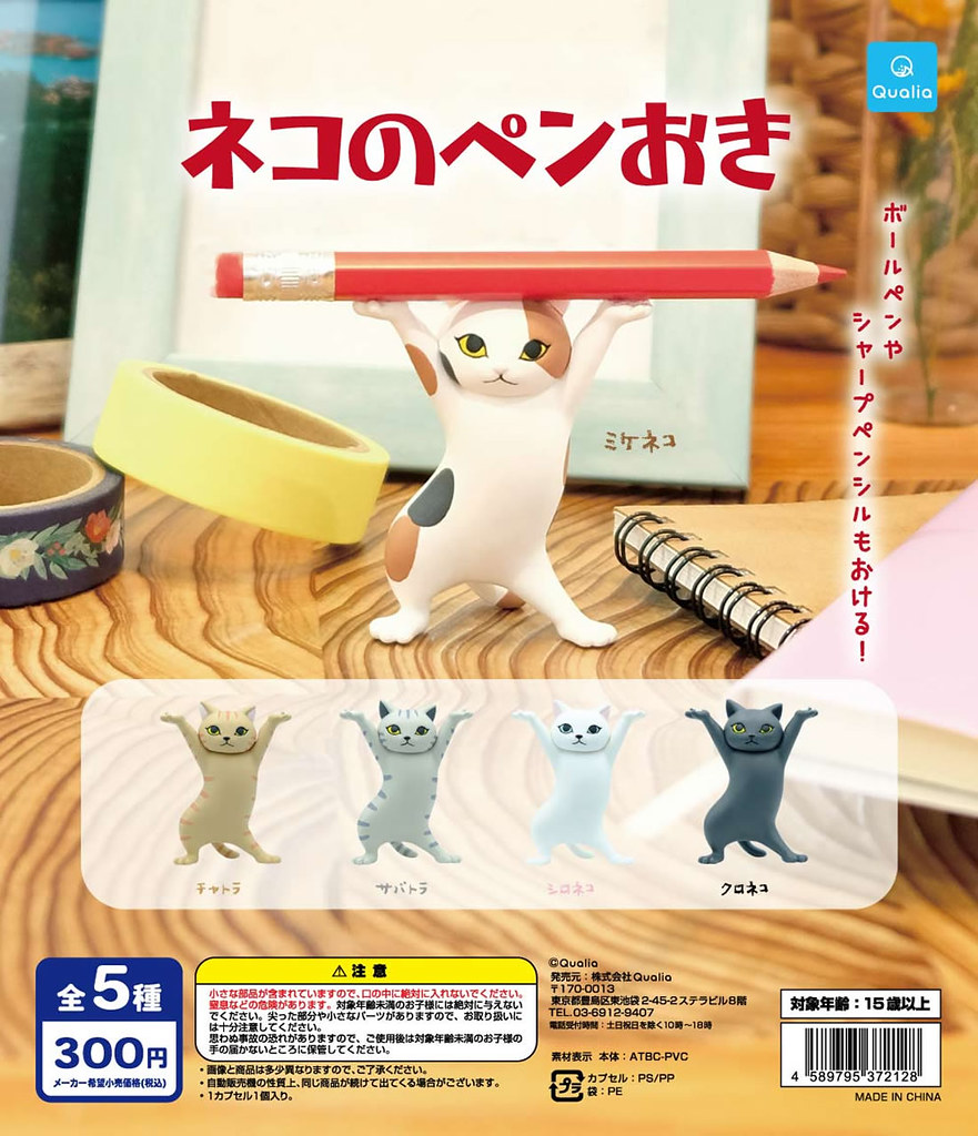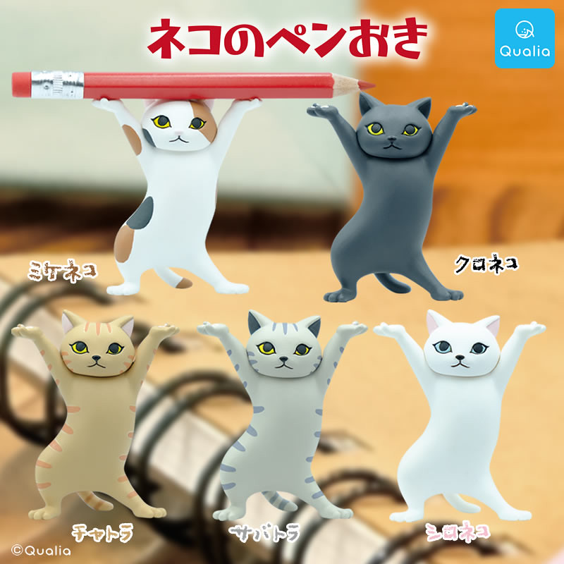 日本趣味轉蛋公司Qualia(株式会社クオリア)推出的搞笑作品「貓咪置筆架」(ネコのペンおき)轉蛋,一共有五種款式,參考售價為一轉 300 日圓,在日本開轉之後,因為無所不扛的奇妙姿勢引發網路話題,而火速推出好評再販,預計2020年06月中旬發售。