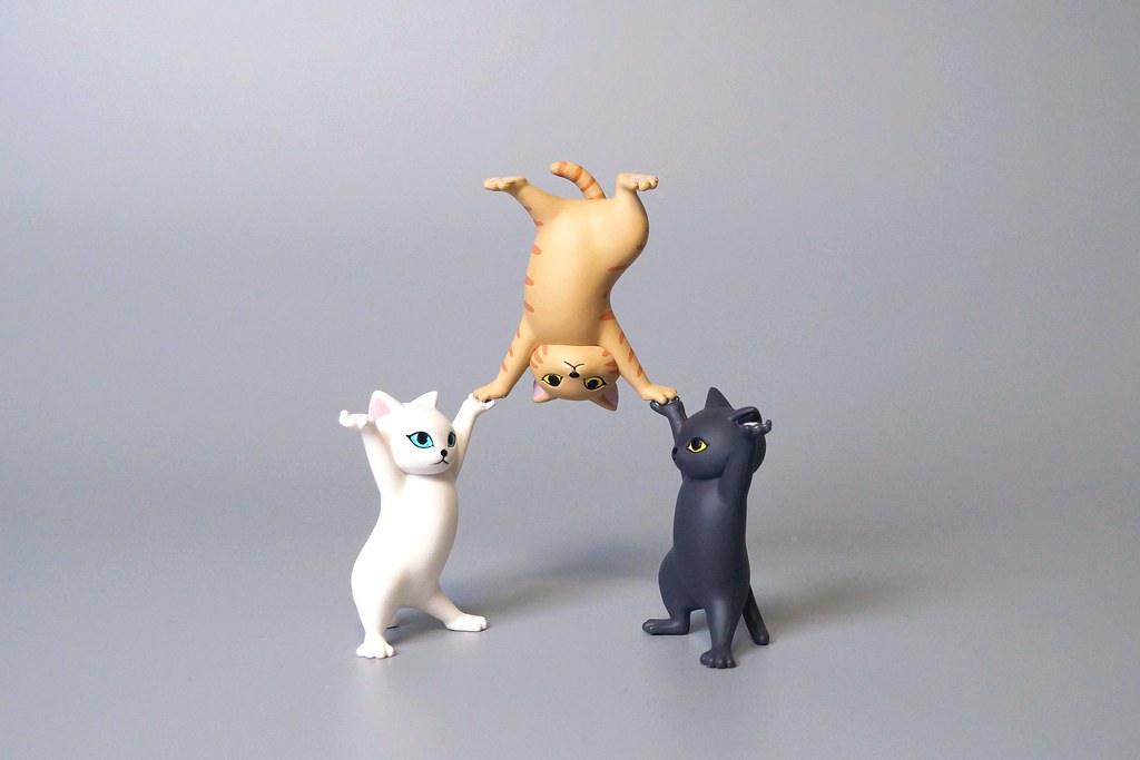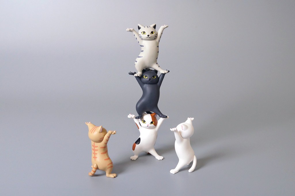 可愛的扭腰姿勢在日本模型師めーちっさい(@meetissai)一系列的貓咪特技玩法下,讓網友也跟著發揮創意,紛紛分享了各種趣味玩法、成為熱門轉蛋。也因此這組賣到缺貨的轉蛋在日本引起炒高價錢的歪風,幸好官方已經推出再販消息啦~